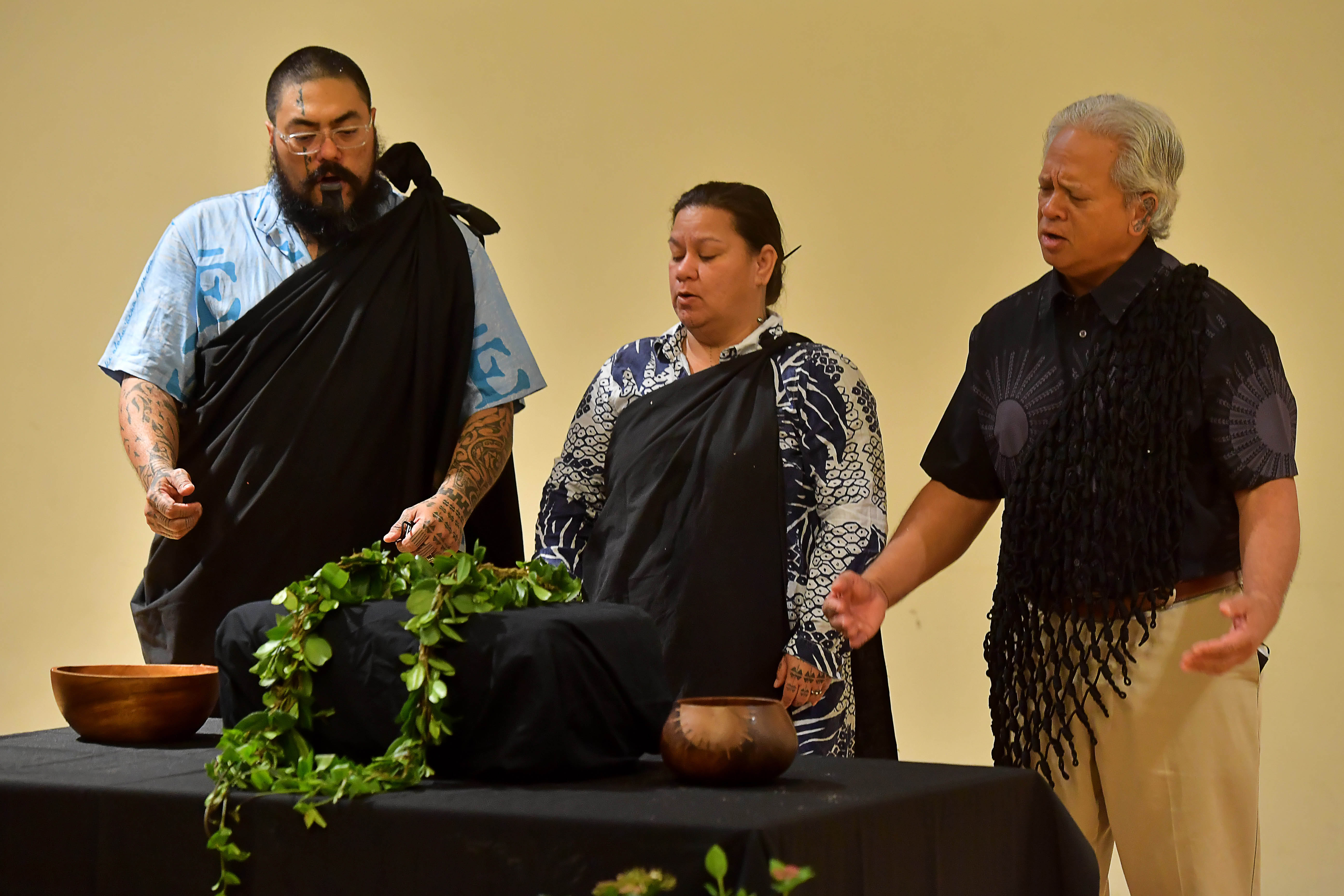 The iwi kūpuna were handed over at a ceremony in the university's auditorium. The Hawaiian delegation, consisting of Edward Halealoha Ayau, who leads repatriation efforts for OHA, and cultural practitioners Kalehua Caceres and Mana Caceres, opened the ceremony with prayers.
