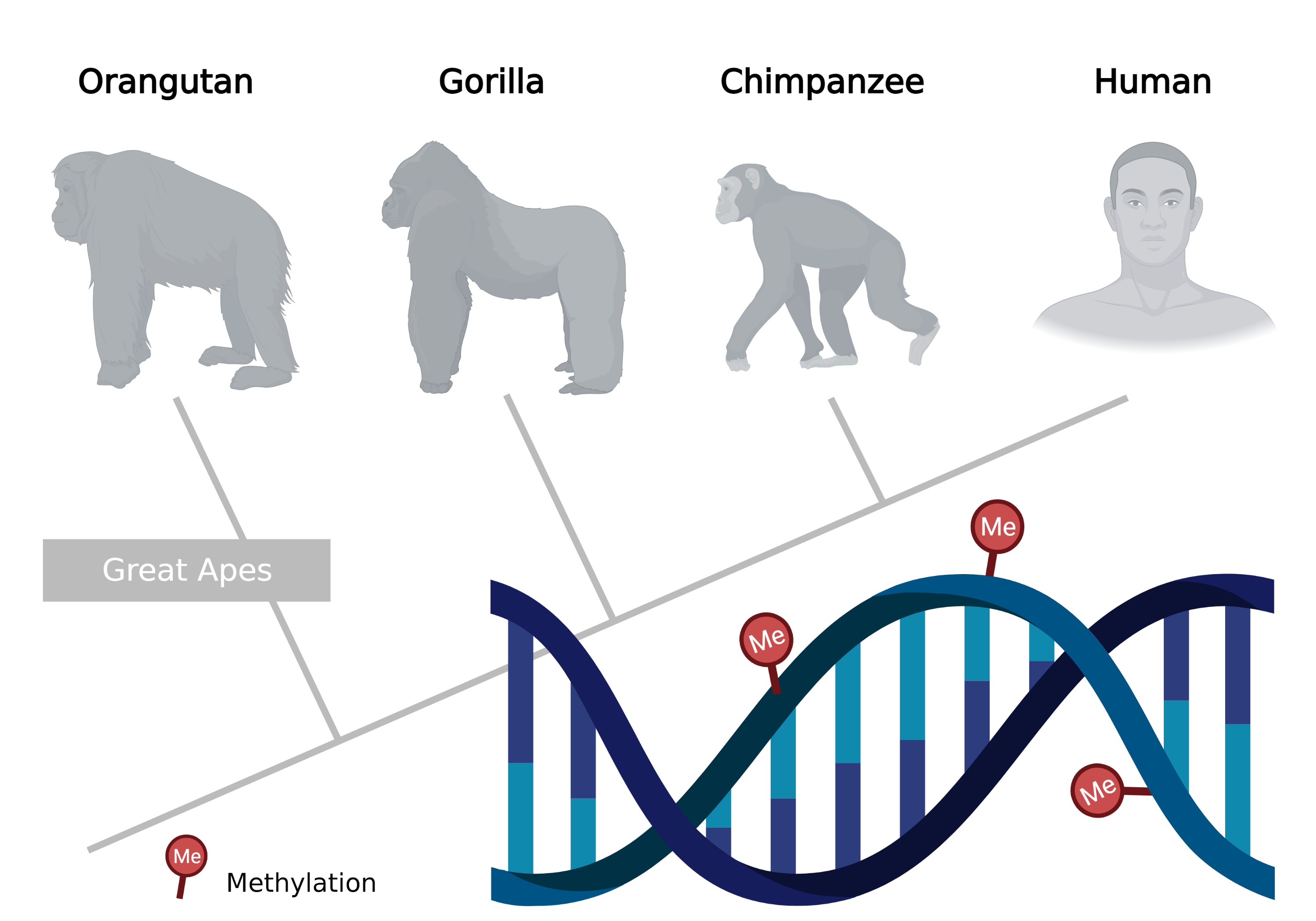 The cells of our body all have the same genetic material. Their genome is identical, but the cells are different, because their genes are differently active. Chemical marks on the DNA, for example through methylation or modification of histones, control the activity of the genes and shape their cell identity (epigenetics). Using methylation data from great apes, researchers at the Leibniz Institute on Aging - Fritz Lipmann Institute (FLI) in Jena, Germany, were able to show that classical sequence-based methods of phylogenetics can also be applied to the field of epigenomics. Phylogenetic trees can be correctly reconstructed and relationships explained from them.