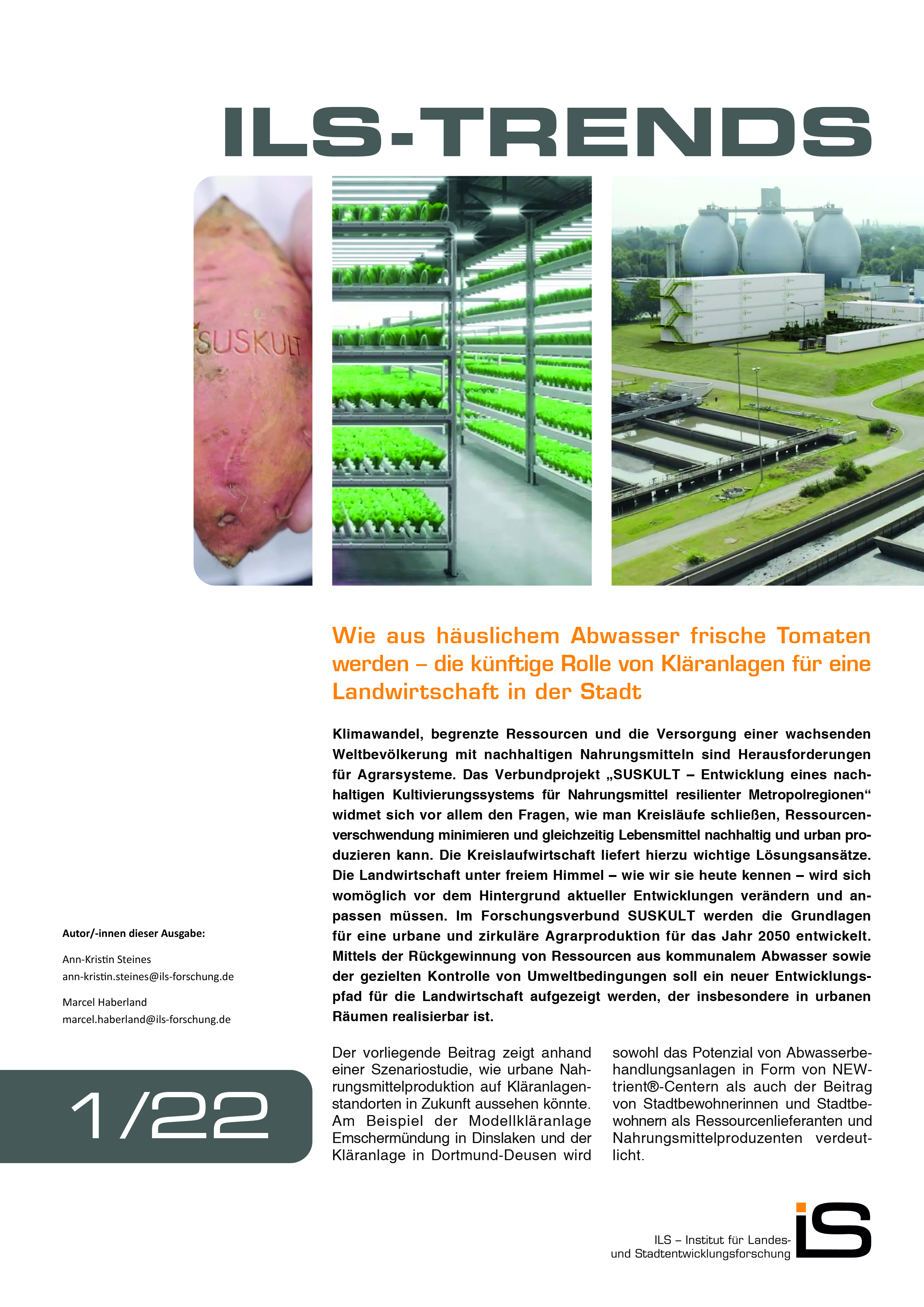 ILS-TRENDS. Ausgabe 1/2022: Wie aus häuslichem Abwasser frische Tomaten werden – die künftige Rolle von Kläranlagen für eine Landwirtschaft in der Stadt von Ann-Kristin Steines und Marcel Haberland. https://www.ils-forschung.de/files_publikationen/pdfs/TRENDS-1.22_SUSKULT_ONLINE.pdf
