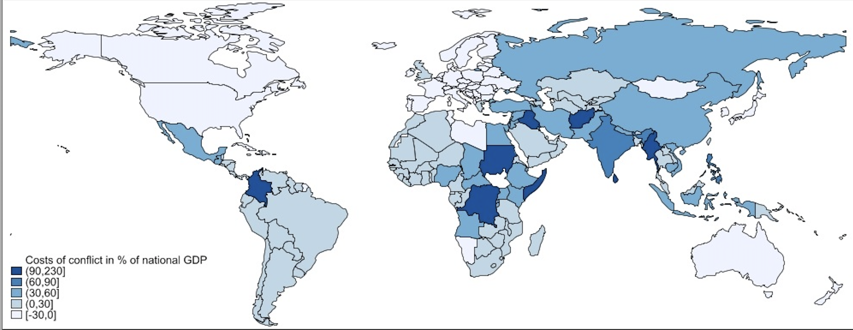 Gewaltsame Konflikte wirken sich negativ auf die Wirtschaftsleistung aus, da sie die Produktion unterbrechen, Militärausgaben Vorrang vor anderen, produktiveren öffentlichen Ausgaben wie Gesundheit und Bildung haben und durch Portfolio-Substitutionen die Verlagerung von Vermögenswerten aus gewalttätigen in friedlichere Länder begünstigen. Darüber hinaus leiden Nachbarstaatten von Ländern mit gewaltsame Konflikten unter erhöhter Unsicherheit und geringerem Handel.