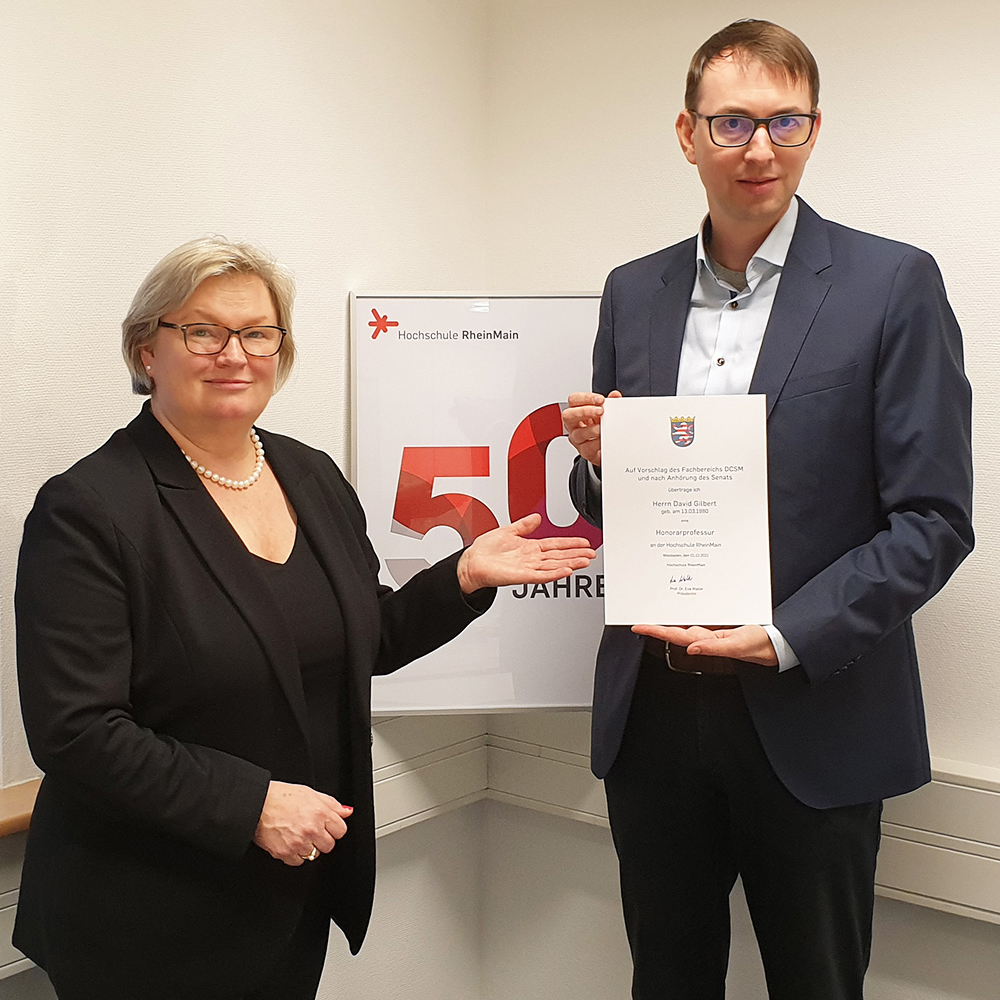David Gilbert ist neuer Honorarprofessor im Fachbereich Design Informatik Medien der Hochschule RheinMain (HSRM). Der Absolvent des Studiengangs Medienwirtschaft der Fachhochschule Wiesbaden, die 2009 in Hochschule RheinMain umbenannt wurde, ist seit 2015 als Chefberater Digital Design & User Experience bei der DB Systel GmbH in Frankfurt am Main tätig. Dort verantwortet er die digitale Gestaltung von IT-Lösungen, die bei der DB Systel im Auftrag der Deutschen Bahn AG entwickelt werden. Bereits seit 2011 ist er Lehrbeauftragter im Studiengang Media Management der HSRM. Am vergangenen Donnerstag erhielt er von Hochschulpräsidentin Prof. Dr. Eva Waller die Urkunde zur Ernennung zum Honorarprofessor.