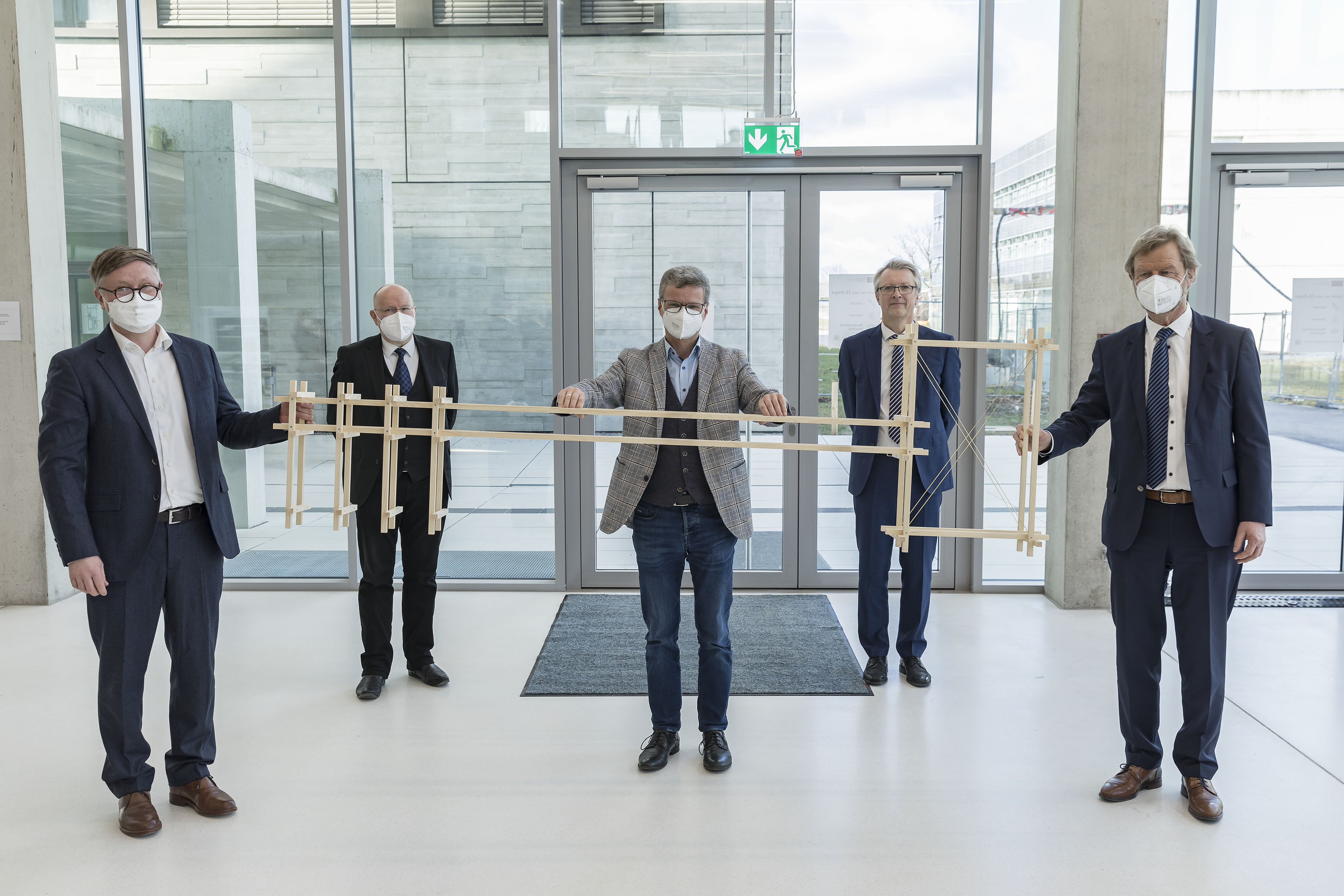 Bevor die Hochschulgeistlichen Pfarrerin Dr. Gabriele Kainz, Studentenpfarrer Hermann Josef Eckl und Pastoralreferentin Rena Kagerer dem vom Architekturbüro Henning Larsen (Kopenhagen/München) entworfenen Neubau den kirchlichen Segen erteilten, würdigte Leitender Baudirektor Gerhard Haslbeck vom Staatlichen Bauamt Regensburg die gute Zusammenarbeit von der Grundsteinlegung im Juli 2018 bis zur Übergabe des Gebäudes an die Fakultät Architektur im Oktober 2021. Der Kostenrahmen der zuletzt genehmigten 34 Millionen Euro sei trotz pandemiebedingter Beeinträchtigungen eingehalten worden. Das Gebäude sei nicht nur beeindruckend, sondern auch nachhaltig. Zusammen mit Bauoberrat Stefan Krabatsch übergab Haslbeck einen überdimensionalen symbolischen Schlüssel, gefertigt in Holzbauweise und inspiriert von Bauhaus und russischem Konstruktivismus gleichermaßen.
