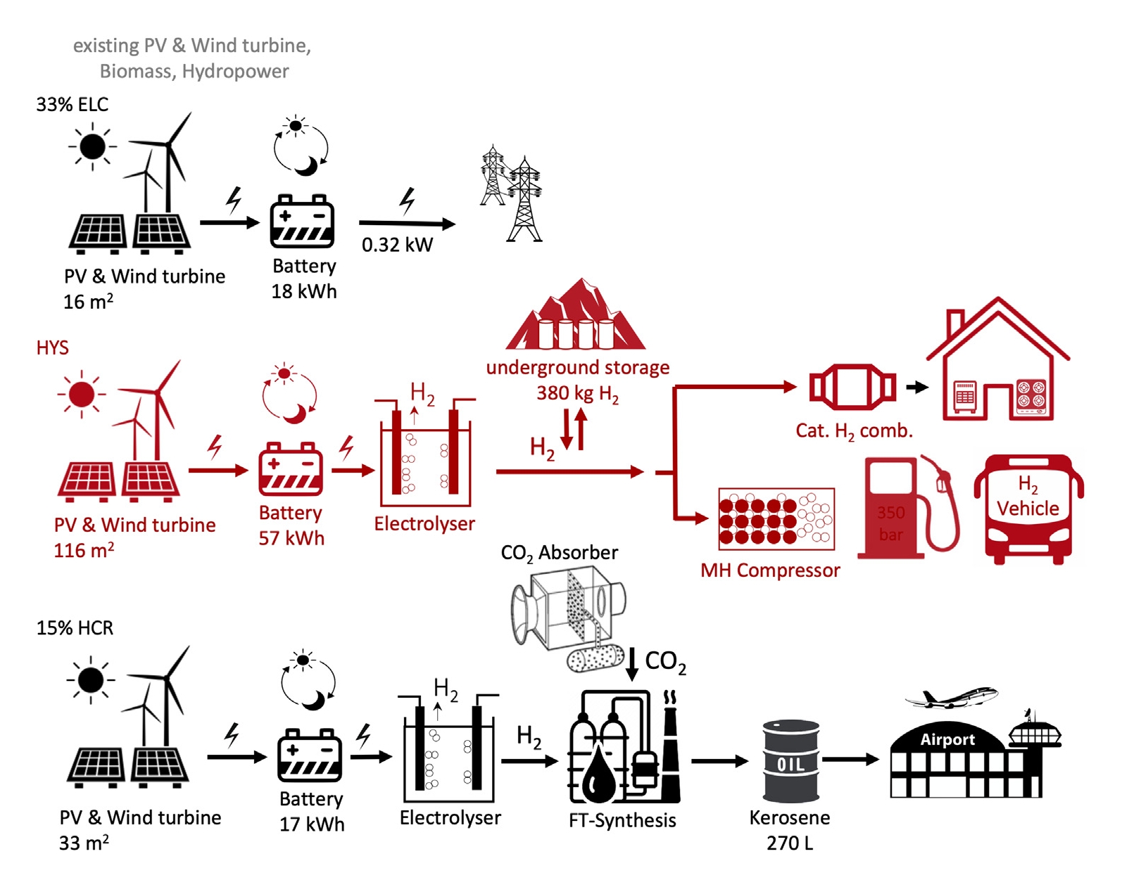 Aus rein energetischer Sicht sei es am effizientesten, die gesamte Energieversorgung zu elektrifizieren, sagt Andreas Züttel. Wenn alle Autos und Lastwagen elektrisch fahren und alle Gebäude mit (elektrischen) Wärmepumpen beheizt werden, steigt der dafür notwendige Strombedarf nur um knapp 1000 Watt pro Kopf – gegenüber dem heutigen elektrischen Energieverbrauch. Um diese Energiemenge zu erzeugen, bräuchte die Schweiz 48 Quadratmeter Solarfläche pro Kopf (das entspricht dreimal der verfügbaren Dachfläche der Schweiz), zusätzlich eine 26 kWh-Speicherbatterie pro Kopf und zur Sommer-Winter-Speicherung zusätzlich 13 Pumpspeicherkraftwerke der Dimension «Grande Dixence». Energieforscher Züttel rechnet vor: «Wenn wir sofort anfangen, müssten wir bis ins Jahr 2035 jedes Jahr eine neue Staumauer bauen. Aber wir haben schlicht nicht genug geeignete Täler im Land für solch eine Grössenordnung.»