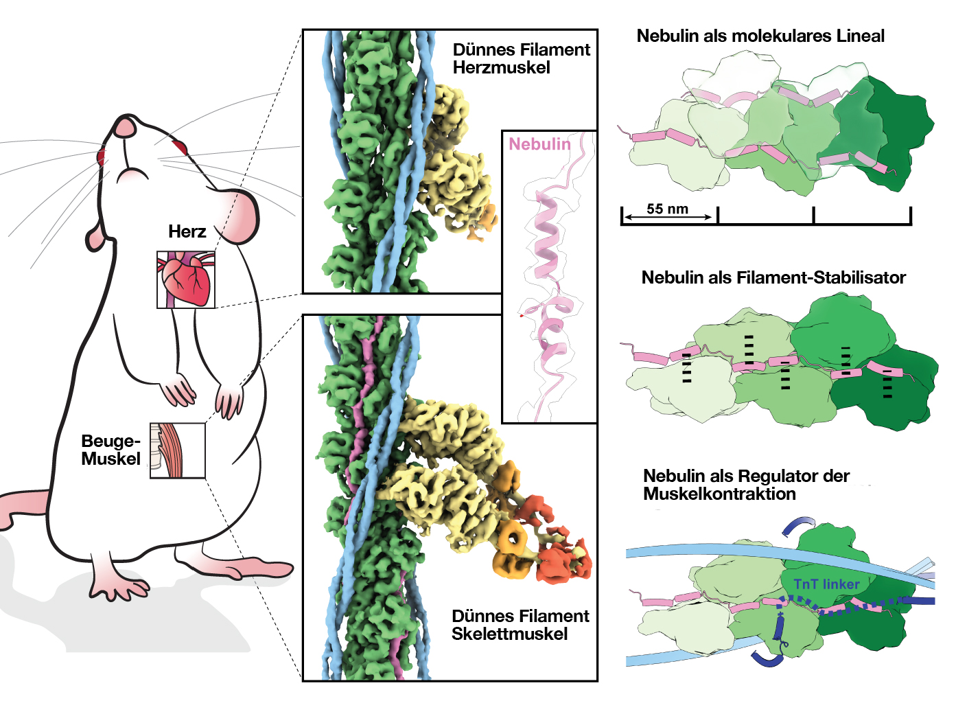 Forschende haben das erste hochaufgelöste 3D-Bild von Nebulin erhalten, einem riesigen aktinbindenden Protein, das ein wesentlicher Bestandteil der Skelettmuskulatur ist. Mit dieser Entdeckung kann die Funktion von Nebulin nun besser verstanden werden, welche aufgrund der Größe von Nebulin und der Schwierigkeit, es im natürlichen Zustand aus dem Muskel zu extrahieren, bisher weitgehend unbekannt war. Das Team unter der Leitung von Stefan Raunser, Direktor am Max-Planck-Institut für molekulare Physiologie in Dortmund, hat in Zusammenarbeit mit Mathias Gautel vom King's College London die Elektronen-Kryo-Tomographie eingesetzt, um die Struktur von Nebulin in beeindruckender Detailgenauigkeit zu entschlüsseln. Die Ergebnisse könnten zu neuen Therapieansätzen bei Muskelkrankheiten wie z.B. der Nemalin-Myopathie führen, da genetische Mutationen in Nebulin mit einem dramatischen Verlust der Muskelkraft einhergehen.