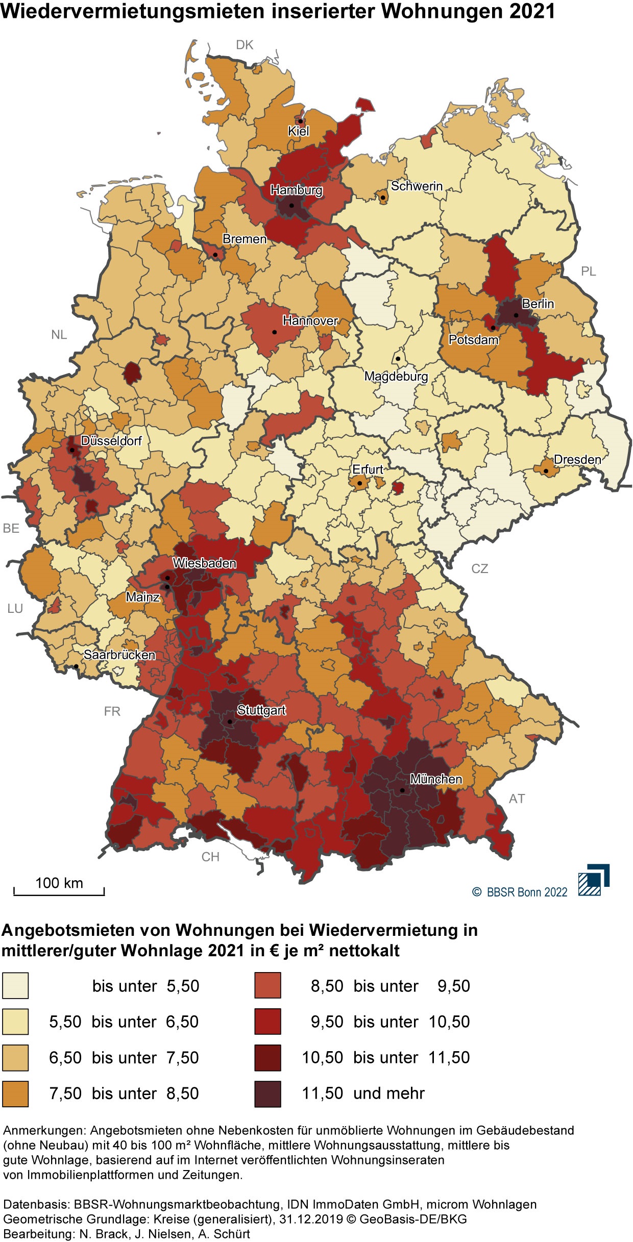 Datengrundlage: Die ausgewerteten Angebotsmieten basieren auf Inseraten aus Immobilienplattformen und von Zeitungen für Wiedervermietungen von Wohnungen im Gebäudebestand (ohne Neubau). Sie spiegeln das Angebot wider, auf das Wohnungssuchende treffen, wenn sie im Internet nach einer Mietwohnung suchen. Zur Standardaufbereitung bis auf die Ebene der Kreise erfolgte eine Eingrenzung der betrachteten Wohnungen auf Wohnflächen von 40 bis 100 m² mit mittlerer Wohnungsausstattung in mittlerer bis guter Wohnlage. Die verwendeten Daten umfassen nettokalte Angebotsmieten, also ohne kalte und warme Nebenkosten. Als Quelle werden die Datenbanken der IDN ImmoDaten GmbH mit Inseraten aus über 120 Immobilienportalen und Zeitungen verwendet, die das BBSR aufbereitet und daraus durchschnittliche Angebotsmieten berechnet. Mit dieser Quelle werden nicht alle Wohnungsangebote erfasst. Inserate aus lokalen Zeitungen, Mieter- oder Unternehmenspublikationen oder von Aushängen können nicht mit einfließen. Wohnungsvermittlungen über Kunden- und Wartelisten von Wohnungsunternehmen oder Maklern können ebenfalls nicht berücksichtigt werden. Daher können gerade Wohnungen im günstigen Mietsegment mit dieser Datenquelle unterrepräsentiert sein. Mieten aus bestehenden Mietverhältnissen lassen sich mit dieser Datengrundlage ebenfalls nicht darstellen.