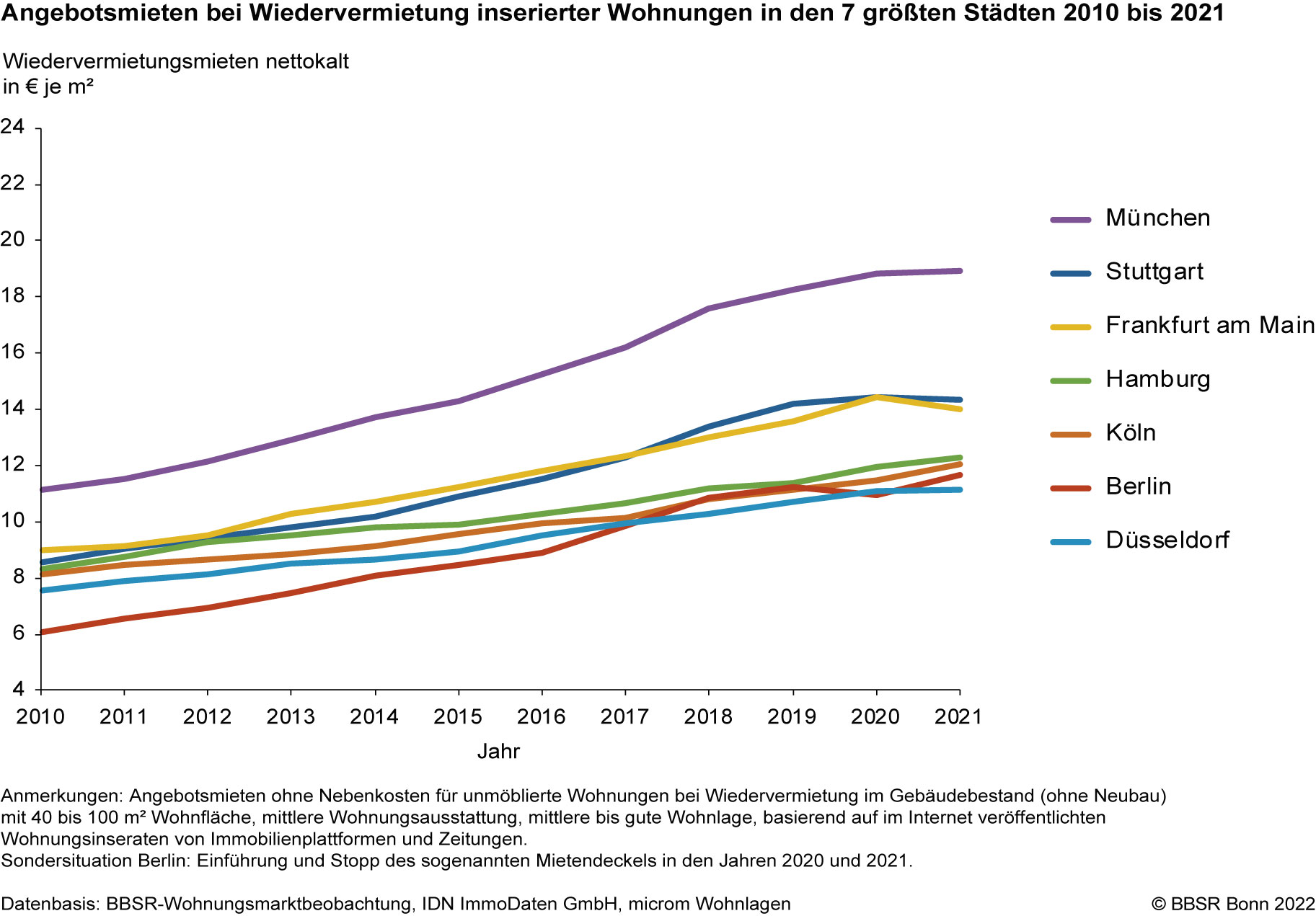 Wegen der Sondersituation mit Einführung (Januar 2020) und Aufhebung (März 2021) des Mietendeckels in Berlin zeigen die Berechnungen der Wiedervermietungsmieten in der Bundeshauptstadt für 2021 einen Anstieg um 6,8 % - nach einem Rückgang von 2,7 % im Vorjahr. Diese Entwicklungen lassen sich wegen der regulatorischen Eingriffe jedoch nicht als Marktentwicklungen interpretieren.