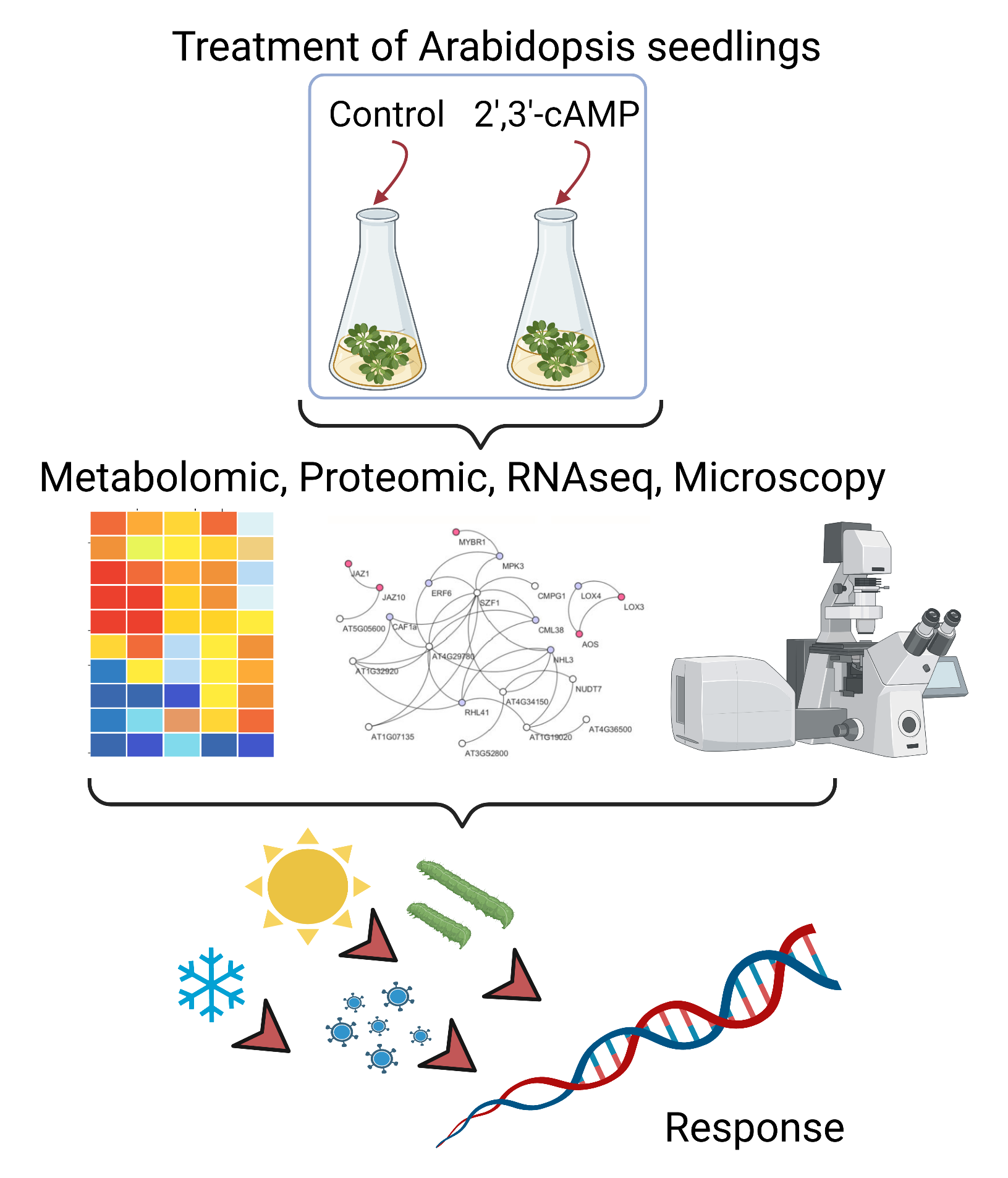 Monika Chodasiewicz, bis vor kurzem Postdoc am MPI-MP in Potsdam-Golm in der Arbeitsgruppe von Aleksandra Skirycz, nun Professorin an der King Abdullah Universität (KAUS) in Saudi-Arabien, erläutert dazu: „Seit unseren Forschungsergebnissen aus dem Jahr 2018, die bereits darauf hinwiesen, dass 2',3'-cAMP eine regulatorische Funktion bei der Bildung von Stressgranula (SG) haben könnte, waren wir uns sicher, dass es mehr als das geben muss.“ Unter Stressgranula versteht man dichte Anhäufungen von Proteinen und RNAs im Zytosol, die entstehen, wenn die Zelle unter Stress steht. Die beiden Wissenschaftlerinnen vermuteten seither, dass 2',3'-cAMP als Signalmolekül dienen könnte, um molekulare Veränderungen als Reaktion auf Stress auszulösen. In der Tat konnten sie in der nun vorliegenden Arbeit mit Hilfe eines Omic-Ansatzes in Kombination mit Zellbiologie nachweisen, dass durch die Zugabe von 2',3'-cAMP eine zelluläre Reaktion ausgelöst wird, die die Reaktion auf Stress imitiert. Die Verabreichung von 2',3'-cAMP führte bei ihren Versuchspflanzen zu Veränderungen auf der Ebene des Transkriptoms (RNA-Moleküle), des Proteoms (Eiweiße) und des Metaboloms (Inhaltsstoffzusammensetzung). Die beobachteten Veränderungen entsprechen den Reaktionen, die bei Stress auftreten. Darüber hinaus wirkt sich 2',3'-cAMP auf die sogenannten processing bodies aus, das sind mikroskopische, abgegrenzte Strukturen in der Zelle, bestehend aus Enzymen, die im m-RNA-Abbau eine wichtige Rolle spielen.