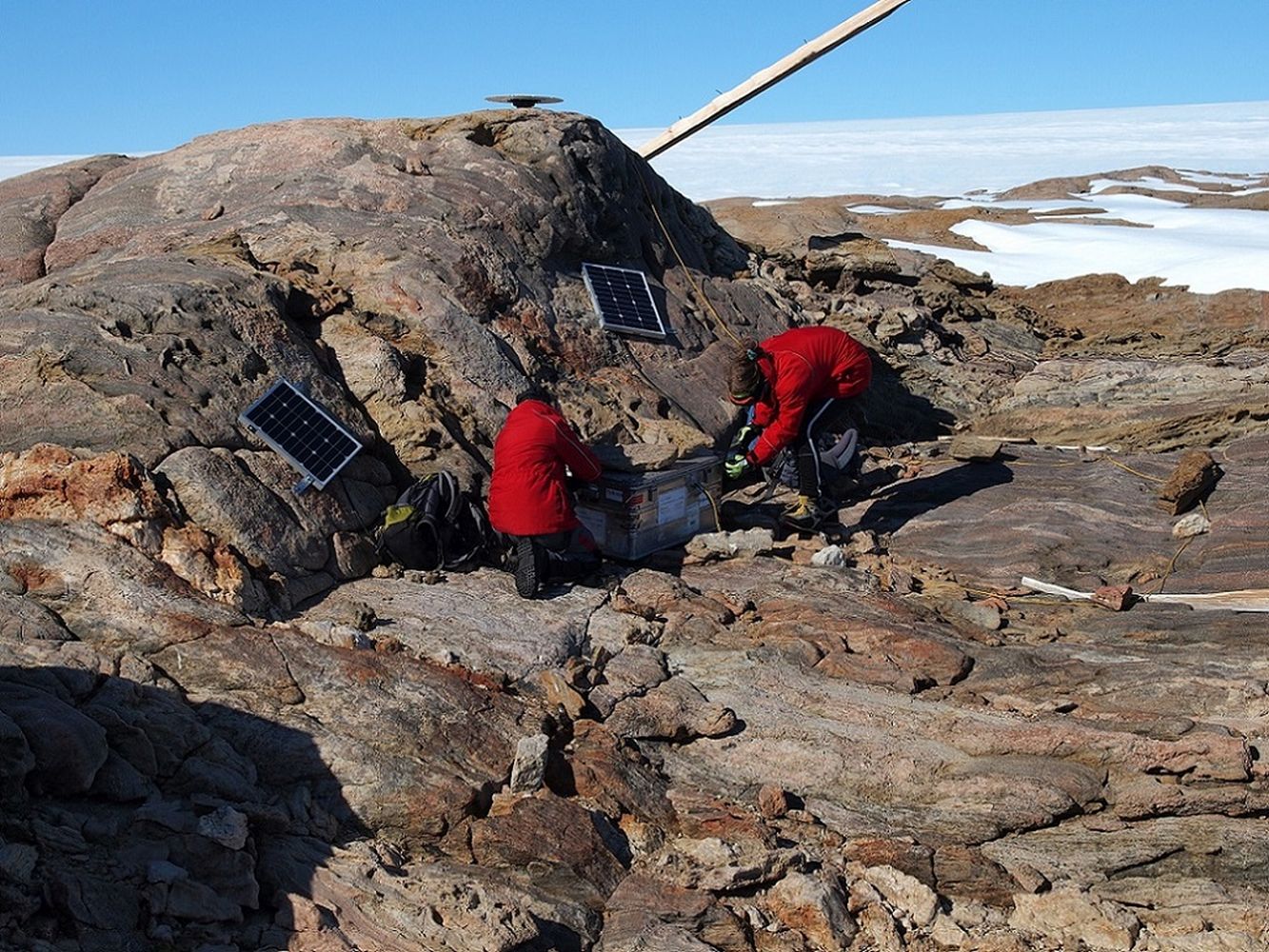An drei speziell markierten Felspunkten konnten Maria Kappelsberger und Karl Heidrich-Meisner geodätische GPS-Messungen für sieben bis zehn Tage realisieren. Durch gemeinsame Auswertung mit den Daten der seit 2006 wiederholt durchgeführten Messkampagnen können Deformationsraten der festen Erde abgeleitet werden. Insbesondere interessiert die Forschenden hier die vertikale Deformationsrate (bzw. Höhenänderung), die am stärksten von den Eismassenänderungen betroffen ist. „Dabei hoffen wir ein Genauigkeitsniveau von 1 mm/Jahr zu erreichen, um auch kleine Änderungen detektieren zu können“, sagt Dr. Mirko Scheinert, Seniorwissenschaftler an der Professur und Leiter dieses durch die Deutsche Forschungsgemeinschaft (DFG) geförderten Projekts. Für die Erfassung der Eismassenänderung muss nicht nur die Gegenwart betrachtet werden, sondern man muss zurück in die Vergangenheit gehen – etwa bis zum Maximum der letzten Eiszeit. Um diese Klimageschichte des Holozän (und möglicherweise noch weiter zurück) zu erforschen, haben die Kolleginnen und Kollegen der Quartärgeologie Sedimentkerne in verschiedenen Seen erbohrt, die dann zu Hause eingehenden Analysen unterzogen werden.