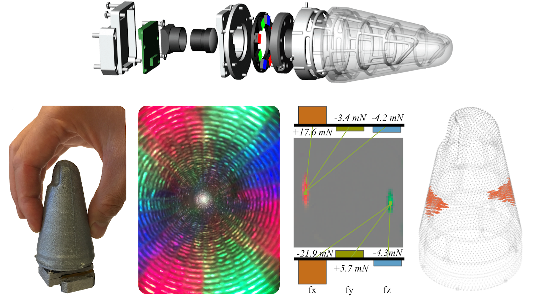 The thumb-shaped sensor is made of a soft shell built around a lightweight stiff skeleton. This skeleton holds up the structure much like bones stabilize the soft finger tissue. The shell is made from an elastomer mixed with dark but reflective aluminum flakes, resulting in an opaque greyish color which prevents any external light finding its way in. Hidden inside this finger-sized cap is a tiny 160-degree fish-eye camera which records colorful images illuminated by a ring of LEDs.