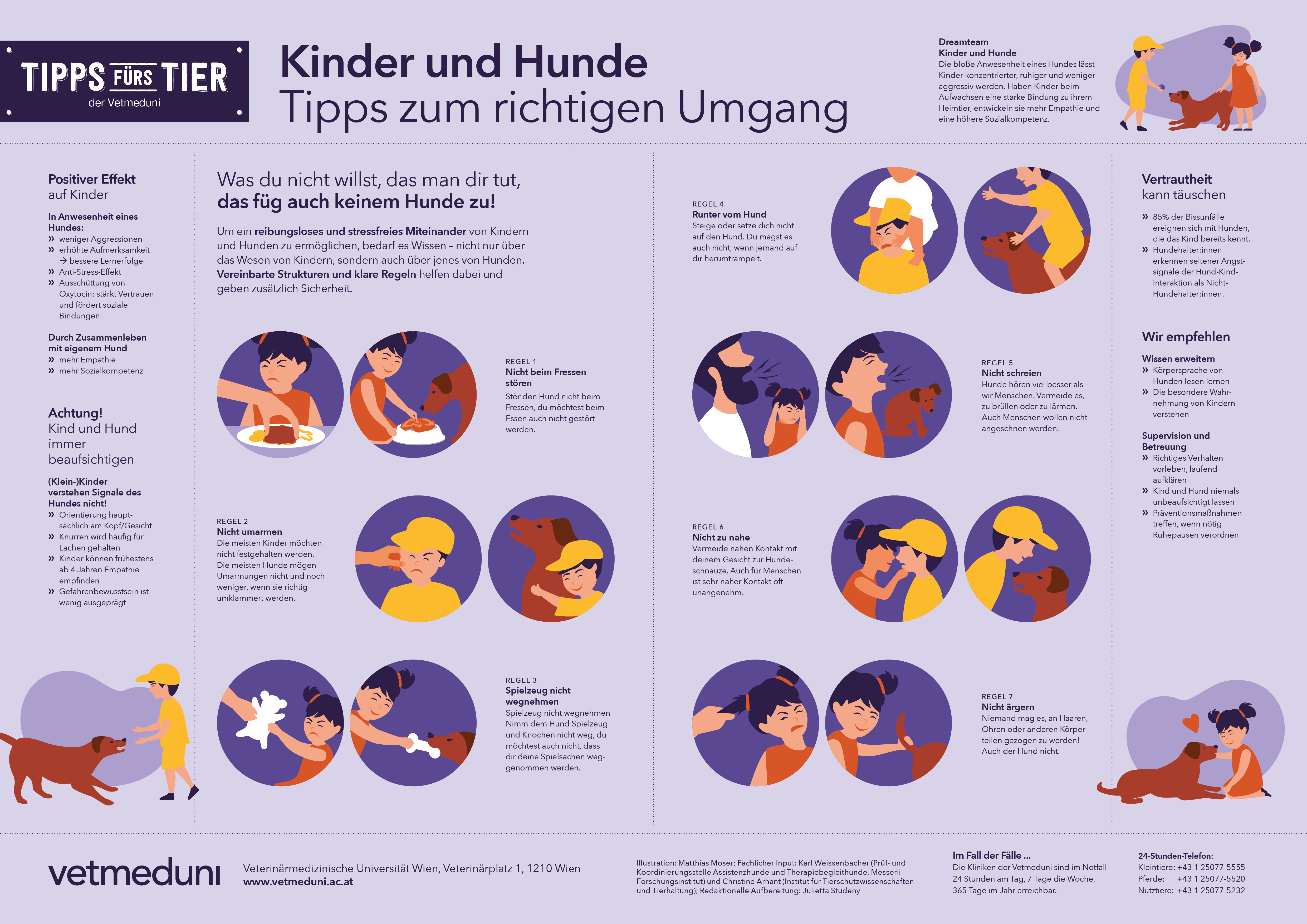 Um ein reibungsloses und stressfreies Miteinander von Kindern und Hunden zu ermöglichen, bedarf es an Wissen – nicht nur über das Wesen von Kindern, sondern auch über jenes von Hunden. Vereinbarte Strukturen und klare Regeln helfen dabei und geben zusätzlich Sicherheit. Die Infografik „Tipps fürs Tier – Kinder und Hunde" der Vetmeduni veranschaulicht Grundregeln für ein sicheres Zusammensein.