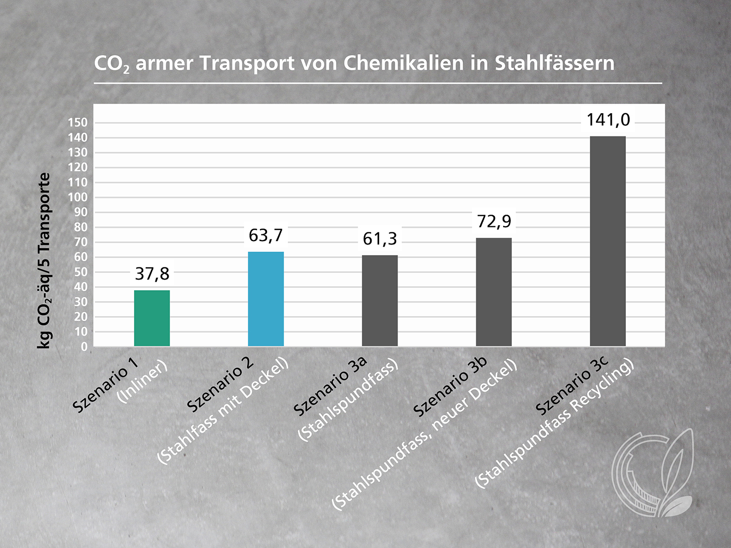 Untersucht wurden dabei fünf verschiedene Szenarien. Im ersten Szenario wird ein Stahldeckelfass mit einem Inliner darin untersucht. Dieses wird nach seiner Nutzung mit dem Refurbishing-Verfahren wieder aufgewertet – sprich der Inliner wird entsorgt und die Dichtungen erneuert. In einem zweiten Szenario untersuchen die Forscher*innen die gleiche Fassart ohne einen Inliner und bilanzieren ein anschließendes Reconditioning des Fasses. Dafür wird das Fass gereinigt, ausgebrannt und neu lackiert, bevor auch hier die Dichtungen erneuert werden. Im dritten Szenario 3a wird ein Stahlspundfass ohne Inliner mit anschließendem Reconditioning untersucht. Zudem werden die Varianten Stahlspundfass ohne Inliner mit anschließendem Reconditioning des Fasses und Umarbeitung zu einem Deckelfass nach erster Nutzung (Szenario 3b) sowie ein Stahlspundfass ohne Inliner für einmalige Nutzung und anschließendem Recycling des Fasses (Szenario 3c) analysiert.