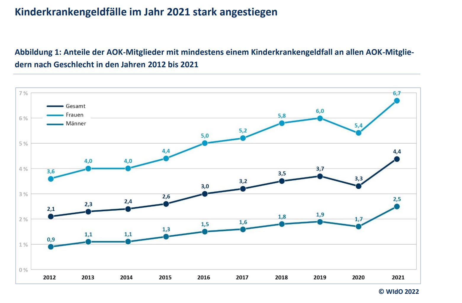 Während im Jahr 2012 nur 2,1 Prozent aller AOK-Mitglieder das Kinderkrankengeld nutzten, waren es 2021 bereits 4,4 Prozent. Somit haben von den 14,6 Millionen erwerbstätigen AOK-Mitgliedern circa 634.500 mindestens einmal Kinderkrankengeld in Anspruch genommen. Nach wie vor sind es vor allem die Mütter, die ihr krankes Kind pflegen: Ihr Anteil an allen AOK-Mitgliedern lag 2021 bei 6,7 Prozent und damit mehr als doppelt so hoch wie bei den Männern. Jedoch steigt der Anteil der Männer, die Kinderkrankengeld beanspruchen, kontinuierlich: Während 2012 nur 0,9 Prozent aller männlichen AOK-Mitglieder Kinderkrankengeld nutzten, waren es 2021 bereits 2,5 Prozent. Ab März 2021 überstieg der Anteil der Beschäftigten mit Kinderkrankengeld den der beiden Vorjahre. Im Oktober und November 2021 – also während der vierten Corona-Welle – war der Anteil der AOK-Mitglieder, die Kinderkrankengeld bezogen, am höchsten.