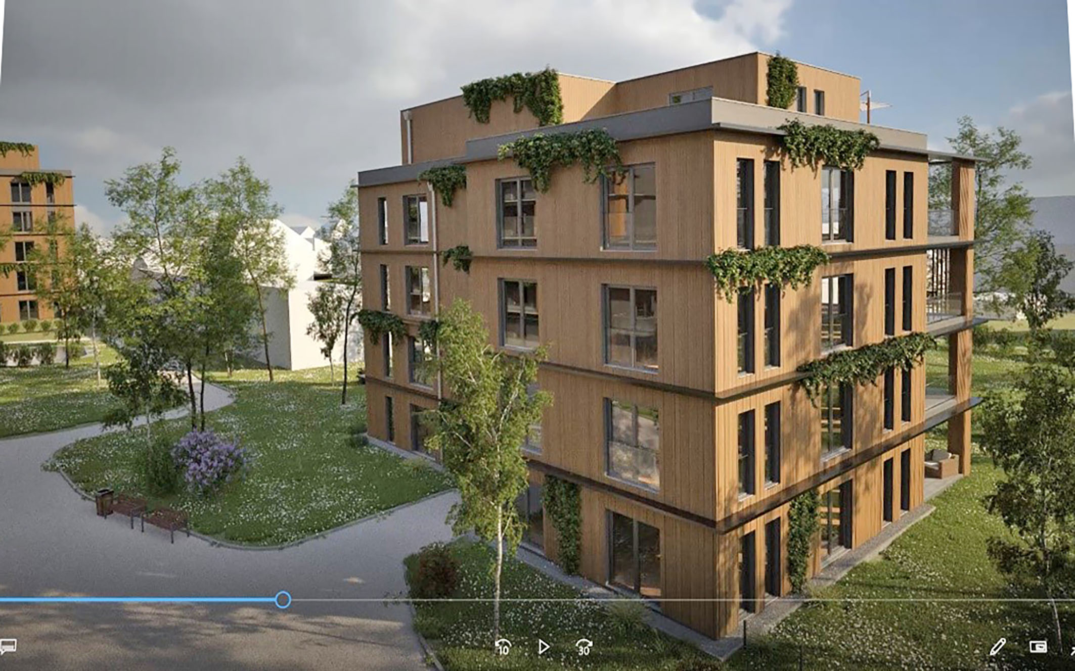 Aufgabe der Studienarbeit war es deshalb, „einen Animationsfilm zu erstellen, der die städtebauliche Idee der Gartenstadt darstellt und vom Projektpartner als Werbevideo genutzt werden kann“, so Betreuer Stefan Sauer. In 60 bis 90 Sekunden sollten den Zuschauerinnen und Zuschauern die wichtigsten Rahmenbedingungen des Konzeptes erläutert werden. Als zentrale Aspekte benannte er die Entstehung hochwertiger Wohneinheiten für unterschiedliche Lebensentwürfe, eine funktionale und visuell ansprechende Architektur mit nachhaltigen Materialen und abwechslungsreicher, naturnaher Fassadengestaltung, eine familienfreundliche, autofreie Innenzone und ökologische Nachhaltigkeit durch Flachdachbegrünung, Photovoltaikanlage, Urban Gardening und E-Ladesäulen. Als Material standen Luftbilder, Fotos, Zeichnungen, Filme und ein CAD-Modell zur Verfügung. Um einen zusätzlichen Anreiz zu setzen, hatte Geschäftsführer Wolfgang Rosentritt ein Preisgeld in Höhe von insgesamt 3.000 Euro ausgelobt.