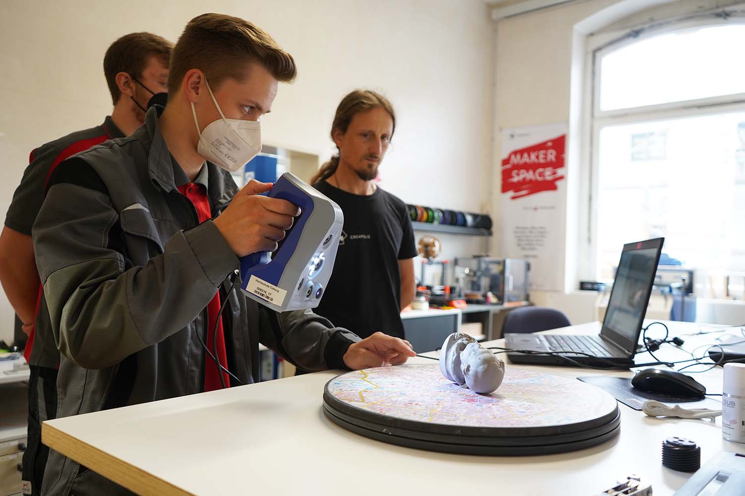 Das CREAPOLIS-Motto „Create“ übernimmt Bodo Neubert selbst. Er zeigte den Auszubildenden, wie 3D-Scan und 3D-Konstruktion funktionieren. Die daraus entstandenen vorläufigen Prototypen nahmen die jungen Männer mit in ihren Betrieb, wo gemeinsam weiter an dem Schneckenrad gefeilt wurde, ganz nach dem Motto „Innovate“.