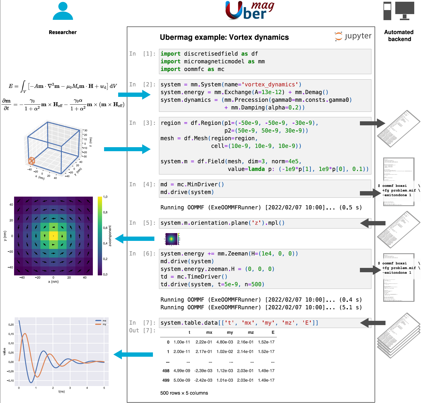 The Figure demonstrates the workflow simplifications and abstractions introduced by Ubermag in a typical use case ¬– here the computation of the dynamics of a magnetic vortex in a ferromagnetic nanostructure. The whole simulation can be driven from a single Jupyter notebook as shown in the central column. The researcher defines the physical problem (cell 2) and the system to study (cell 3). Both can be visualised directly inside the notebook as indicated on the lefthand side. Ubermag internally communicates with a low-level simulation tool (cells 3, 4 and cell 6) shown as the autonomous backend in the right column, and returns the simulation results in a high-level format (cells 5 and 7). Plots of the simulation results and further data analysis are part of the notebook. The notebook shown here is a simplified and shortened version of an introductory notebook available at https://ubermag.github.io/demo.html.
