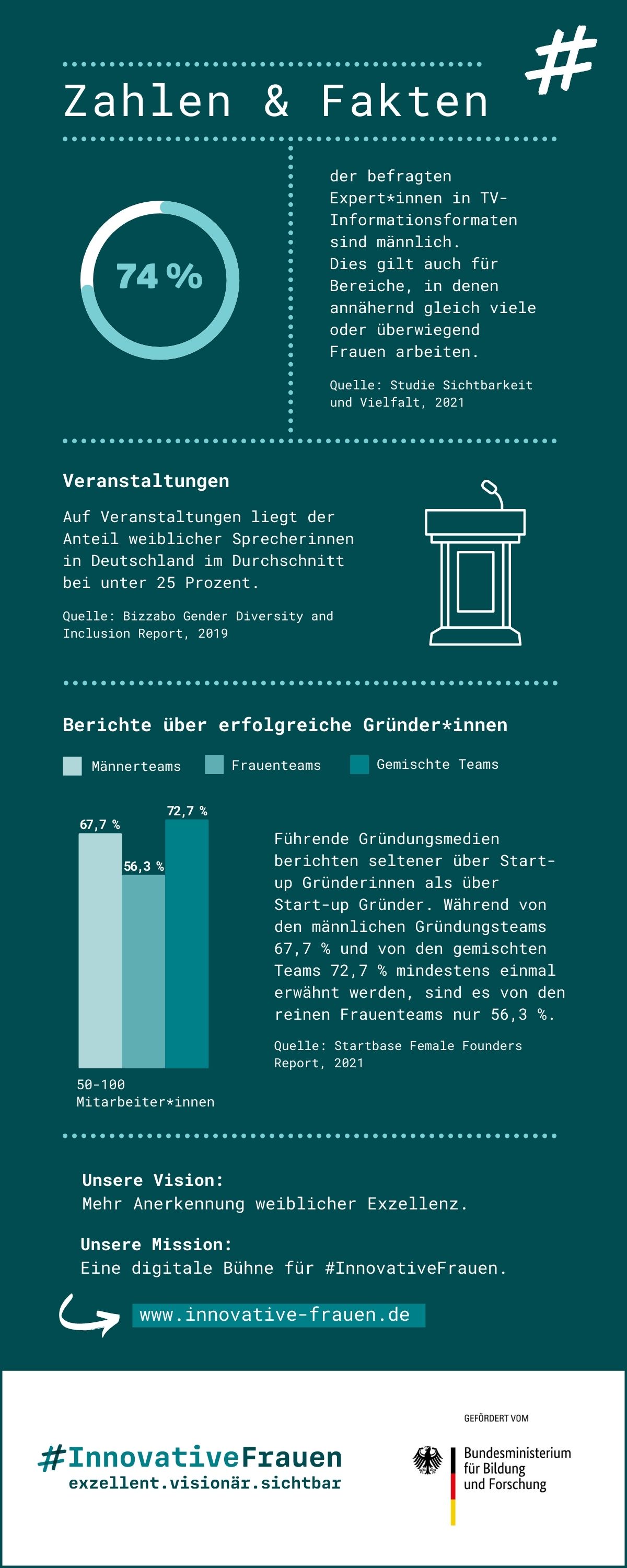 „Innovative und fachlich versierte Frauen werden immer noch zu wenig in der Öffentlichkeit mit ihren Leistungen und Potenzialen wahrgenommen. Mit unserer Plattform #InnovativeFrauen wollen wir das ändern und die Sichtbarkeit dieser Frauen deutlich erhöhen. Wir wollen zeigen, was sie antreibt, wie sie Zukunft mitgestalten und Lösungen für drängende Probleme finden,“ so Carola Herbst, Leiterin des gleichnamigen Projekts, das im Kompetenzzentrum Technik-Diversity-Chancengerechtigkeit e. V. angesiedelt ist und vom Bundesministerium für Bildung und Forschung (BMBF) über eine Laufzeit von drei Jahren gefördert wird. Ein Blick auf die Zahlen zeigt, dass Frauen tatsächlich nach wie vor seltener als Expertinnen in die mediale Berichterstattung einbezogen werden als ihre männlichen Kollegen – und zwar auch in den Bereichen, in denen annähernd gleich viele oder überwiegend Frauen arbeiten. Insgesamt betrachtet sind 74 Prozent der Expert*innen in TV-Informationsformaten männlich. Auch auf Veranstaltungen überschreitet der Anteil weiblicher Podiumsteilnehmerinnen oder Sprecherinnen selten 1/3. Hinzu kommt, dass Frauen, auch wenn sie gründen, weniger Aufmerksamkeit erhalten. Start-up Gründerinnen werden beispielsweise in Gründungsmedien seltener erwähnt als männliche Start-up Gründer.