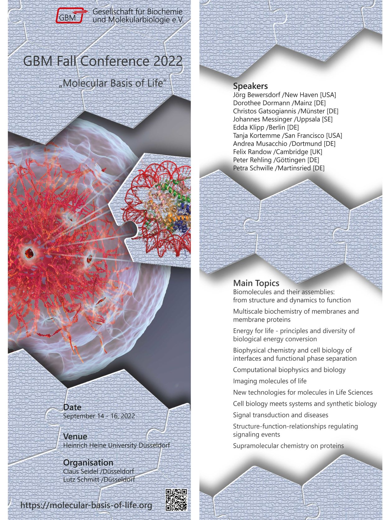 The biennial international fall conference of the German Society for Biochemistry and Molecular Biology (GBM e.V.) will take place from September 14th to 16th 2022, at Heinrich Heine University Düsseldorf. With this congress, GBM will bring together a wide range of researchers from Germany and from across the globe to explore ‘The Molecular Basis of Life’.