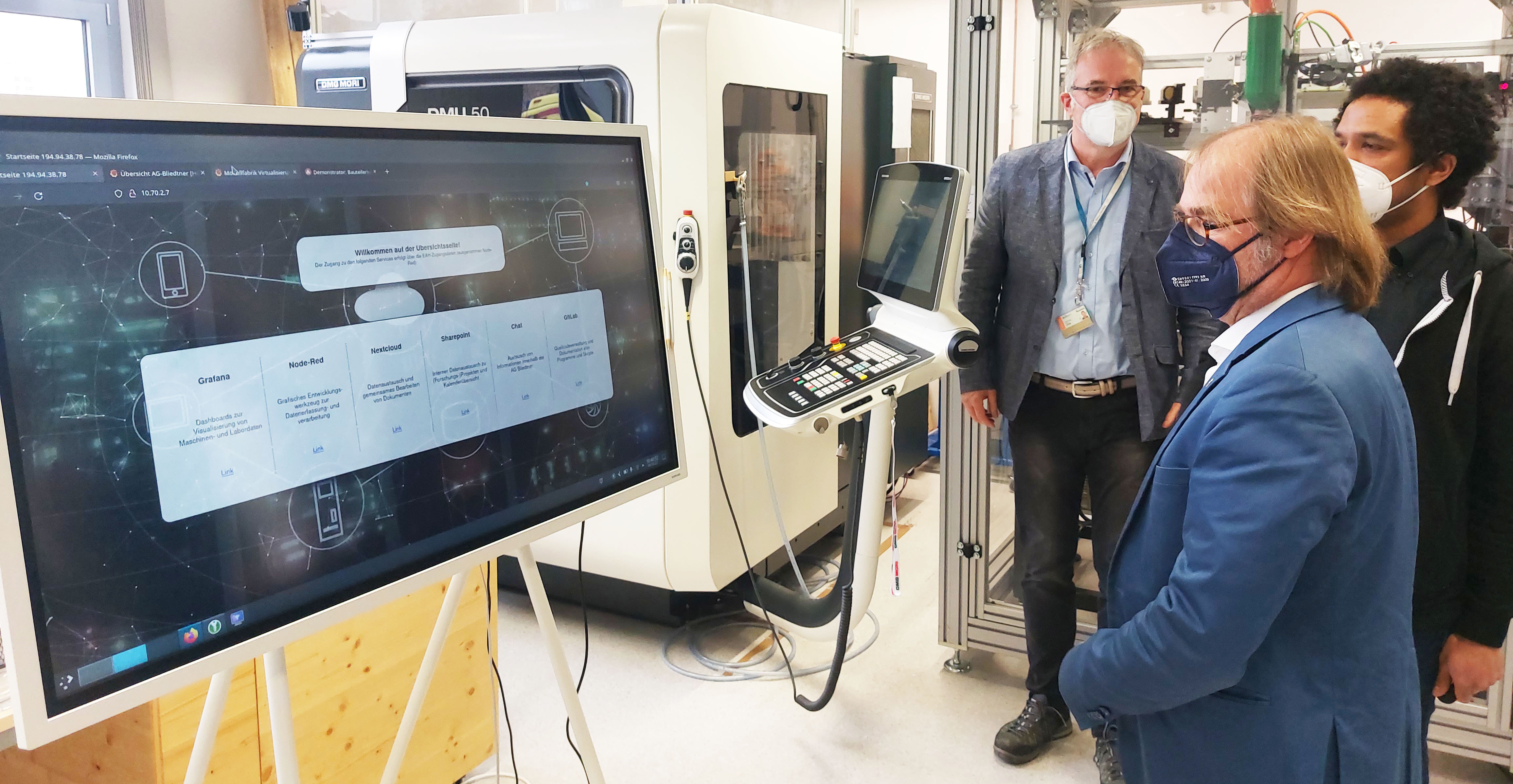Während des Rundgangs durch die Labore wurden verschiedene Forschungsanlagen und -anwendungen der Arbeitsgruppe von Prof. Dr. Jens Bliedtner gezeigt. Außerdem stellte die Modellfabrik verschiedene Demonstratoren vor, die dazu dienen, Unternehmen Einblicke in digitale Lösungen in der praktischen Anwendung zu geben. Das umfasst zum Beispiel die Auswahl geeigneter 3D-Druck-Verfahren und Materialien, die Aufbereitung und Verarbeitung von 3D-Daten,das Management von produktionsrelevanten Informationen, aber auch Lösungen aus dem Bereich Digitale Arbeitswelten, wie zum Beispiel der Einsatz von AR und VR im Produktionsumfeld sowie die Konzeption Virtueller Rundgänge.
