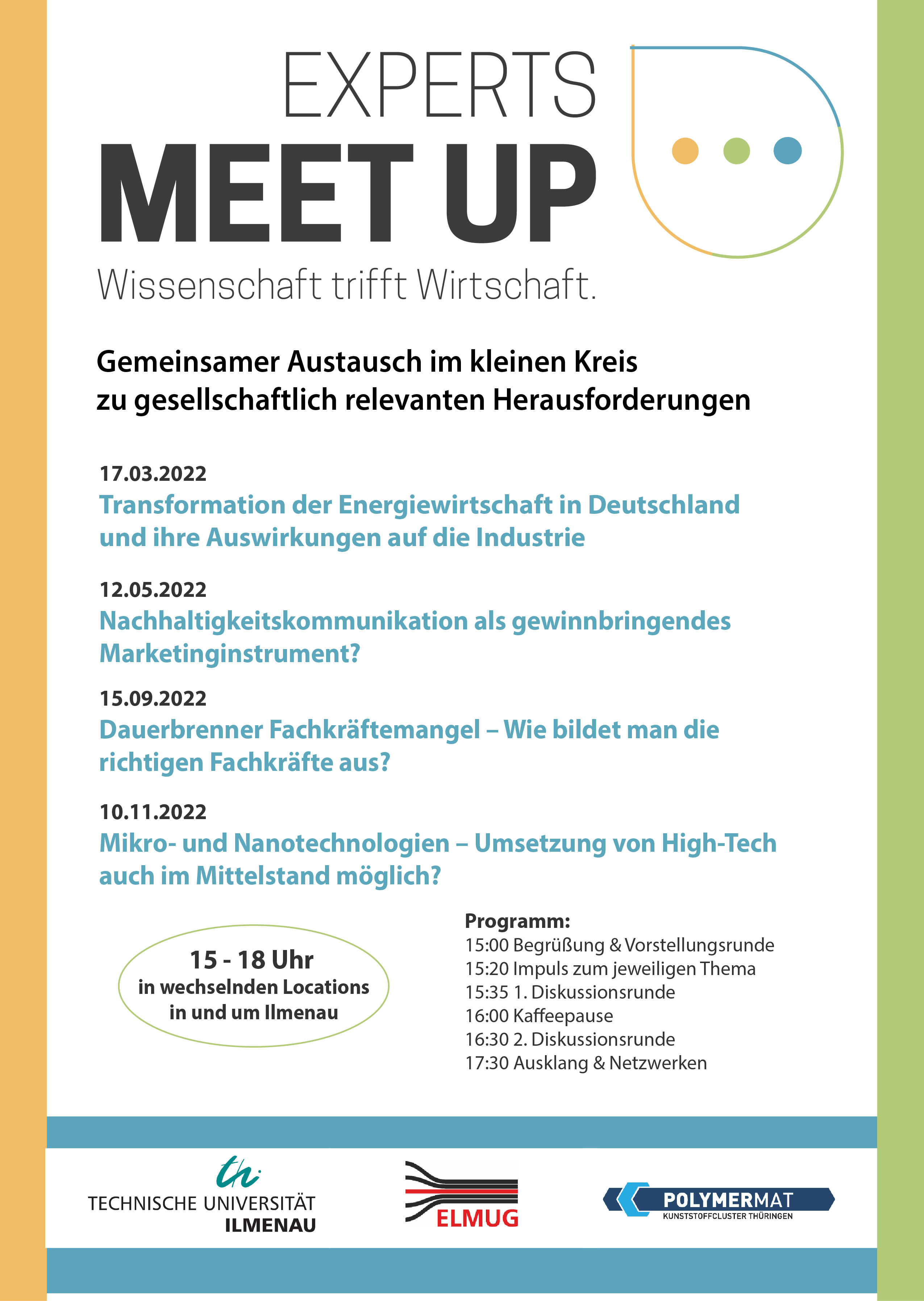 Die Technische Universität Ilmenau ruft gemeinsam mit PolymerMat und ELMUG ein neues Gesprächsformat ins Leben: „Experts Meet Up – Wissenschaft trifft Wirtschaft“. Zum Dialog trifft sich mehrmals im Jahr ein wechselnder Kreis von rund 20 Vertretern der drei Ausrichter der Veranstaltung: der TU Ilmenau und der Thüringer Unternehmensnetzwerke PolymerMat Kunststoffcluster Thüringen und ELMUG, einem Industriecluster im Bereich elektronische Mess- und Gerätetechnik. Von dem internen Expertenaustausch erhofft sich die TU Ilmenau einen offenen Dialog über aktuelle Fragen und Herausforderungen aus Wirtschaft, Wissenschaft und Gesellschaft.