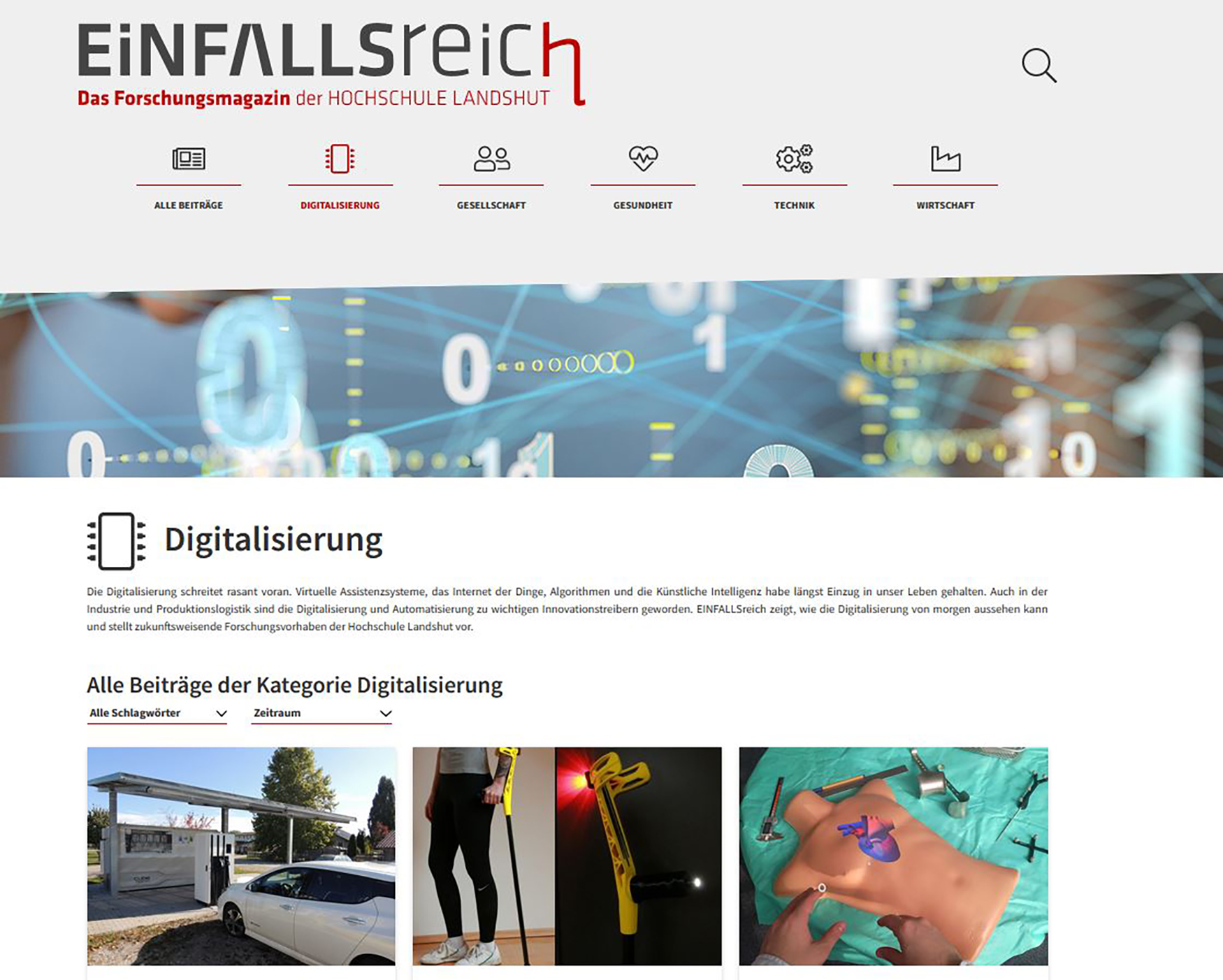 „EINFALLSreich beleuchtet wichtige Themen unserer Zeit wie Digitalisierung, Gesellschaft und Gesundheit sowie Technik und Wirtschaft und berichtet über wissenschaftliche Erkenntnisse und aktuelle Forschungsvorhaben an unserer Hochschule“, sagt Prof. Dr, Holger Timinger, Vizepräsident Forschung und Transfer der Hochschule Landshut. In Form von Interviews, Porträts und News erfahren Leserinnen und Leser zum Beispiel Neuigkeiten über nachhaltige Elektromobilität und Energieversorgung, Operationen der Zukunft mit Hilfe von Augmented Reality oder soziale Themen wie Geschlechterforschung und Kinderrechte. „Die Online-Publikation bietet spannende Einblicke in den Forschungsalltag“, so Timinger. „Wir hoffen, damit wissenschaftliche Themen einem breiten Publikum näherzubringen und auch Nicht-Wissenschaftler*innen dafür zu begeistern.“