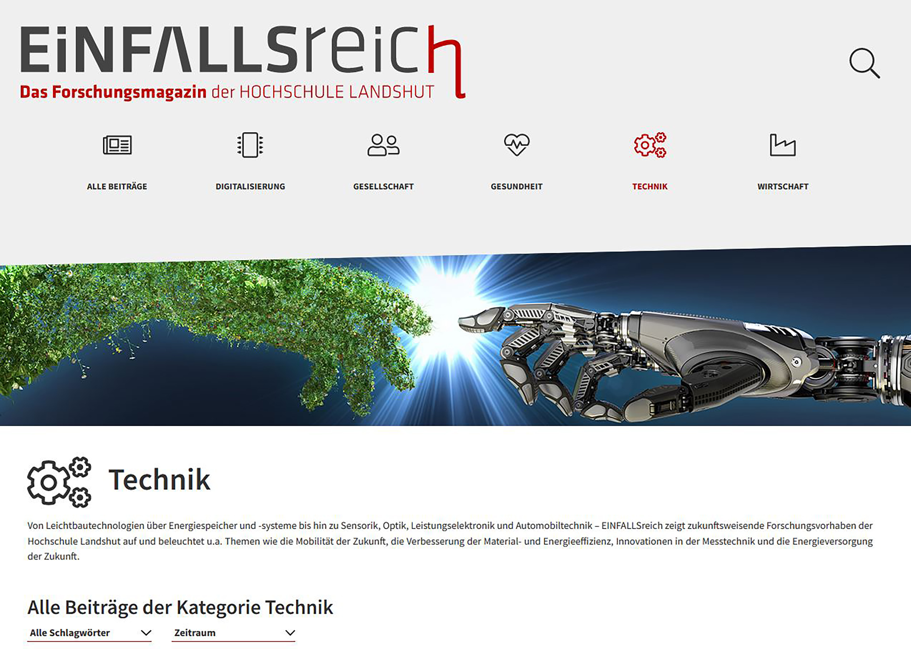 Neue Ideen bringen die Gesellschaft voran. So einfallsreich Forschungsprojekte sind, so vielfältig sind die Wissenschaftlerinnen und Wissenschaftler in ihren Disziplinen. Mit dem Ziel, die vielen spannenden Projekte und interessanten Persönlichkeiten aus der Wissenschaft in den Fokus zu stellen, hat die Hochschule Landshut das neue Forschungsmagazin mit dem Titel „EINFALLSreich“ (https://einfallsreich.haw-landshut.de/) entwickelt. Es richtet sich sowohl an Wissenschaftlerinnen und Wissenschaftler, als auch an Studierende sowie die breite Öffentlichkeit, die sich für Forschungsthemen interessiert.