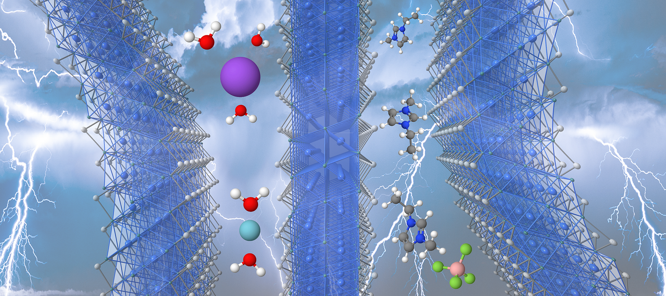 Um das Beste aus beiden Welten miteinander zu verbinden, forscht die Wissenschaft intensiv an sogenannten Pseudokondensatoren. Dies sind elektrochemische Energiespeicher, die sich elektrisch wie ein Kondensator verhalten und damit besonders schnell geladen werden können. Ihr Energiespeichermechanismus hingegen funktioniert wie bei einer Batterie: Energie wird durch Ioneneinlagerung in Kristallgittern gespeichert. Diese besonderen Eigenschaften können häufig durch den Einsatz von 2D-Materialien als Elektroden erreicht werden. Dr. Simon Fleischmann, ehemaliger INM-Mitarbeiter und Doktorand der Universität des Saarlandes und heute Nachwuchsgruppenleiter am Helmholtz-Institut Ulm führt aus: „Das besondere an 2D-Materialien ist ihr flexibler Zwischenschichtraum. Durch eine gezielte Einstellung der Netzebenenabstände im Bereich um 1 Nanometer können wir interessante Nanoeffekte im so genannten „confinement“ beobachten.“ Damit gemeint ist, dass sich Ionen und Elektrolyte, die man zum Ionentransport benötigt, in so kleinen Nanoräumen ganz anders verhalten als in einem großen Volumen oder an einer Oberfläche. Das richtige „matching“ von Ionengröße, Elektrolyt und Nanoraum des Elektrodengitters kann eine deutliche Steigerung der Energiespeicherkapazität und Schnellladefähigkeit ermöglichen.