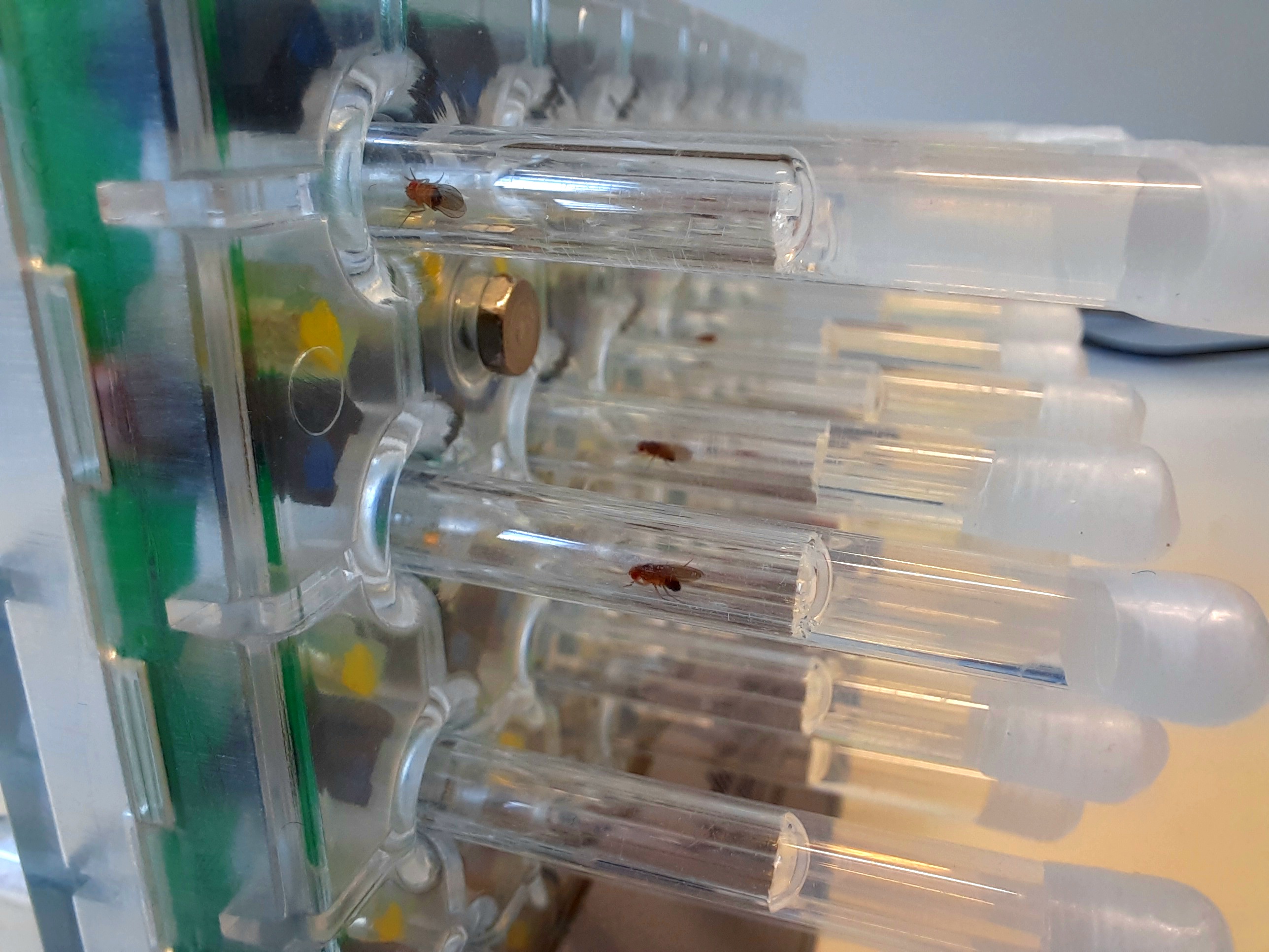 Vollständige Bildzeile (Motiv "Versuchsaufbau"): Versuchsaufbau zur automatisierten Messung der Bewegungsaktivität von Taufliegen: In jedem der Glasröhrchen befindet sich eine Fliege. Wenn sie hin und her läuft, unterbricht sie einen Infrarotstrahl, was über einen Sensor registriert wird. Die Anzahl der Unterbrechungen gilt als Maß für die Aktivität. Während der Messungen werden die äußeren Bedingungen wie Licht und Temperatur genau kontrolliert.