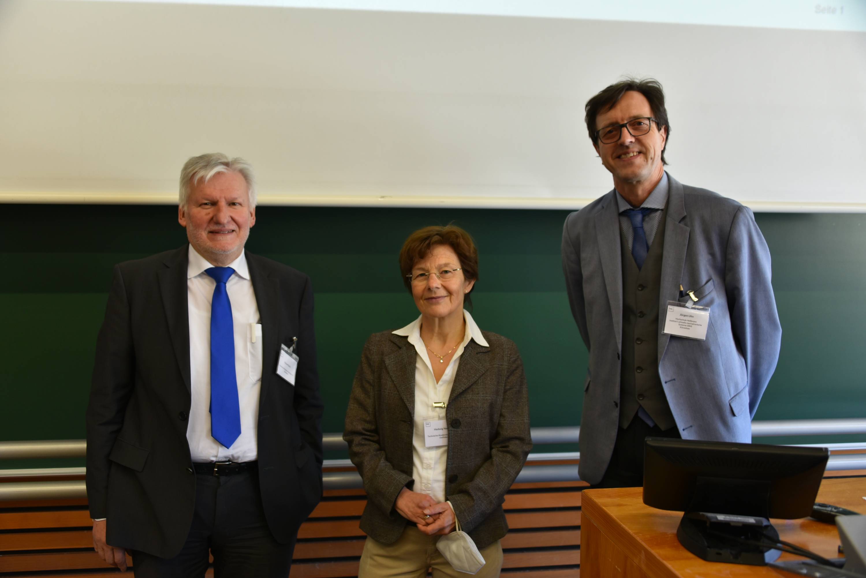 Informationen zu den Personen, von links nach rechts: Roland Bach (Geschäftsfeldleiter TAE), Hedwig Neuhoff (Assistentin der Geschäftsfeldleitung Elektrotechnik), Professor Jürgen Ulm (Geschäftsführender Direktor das Institut für Digitalisierung und Elektrische Antriebe (IDA) am Campus Künzelsau.
