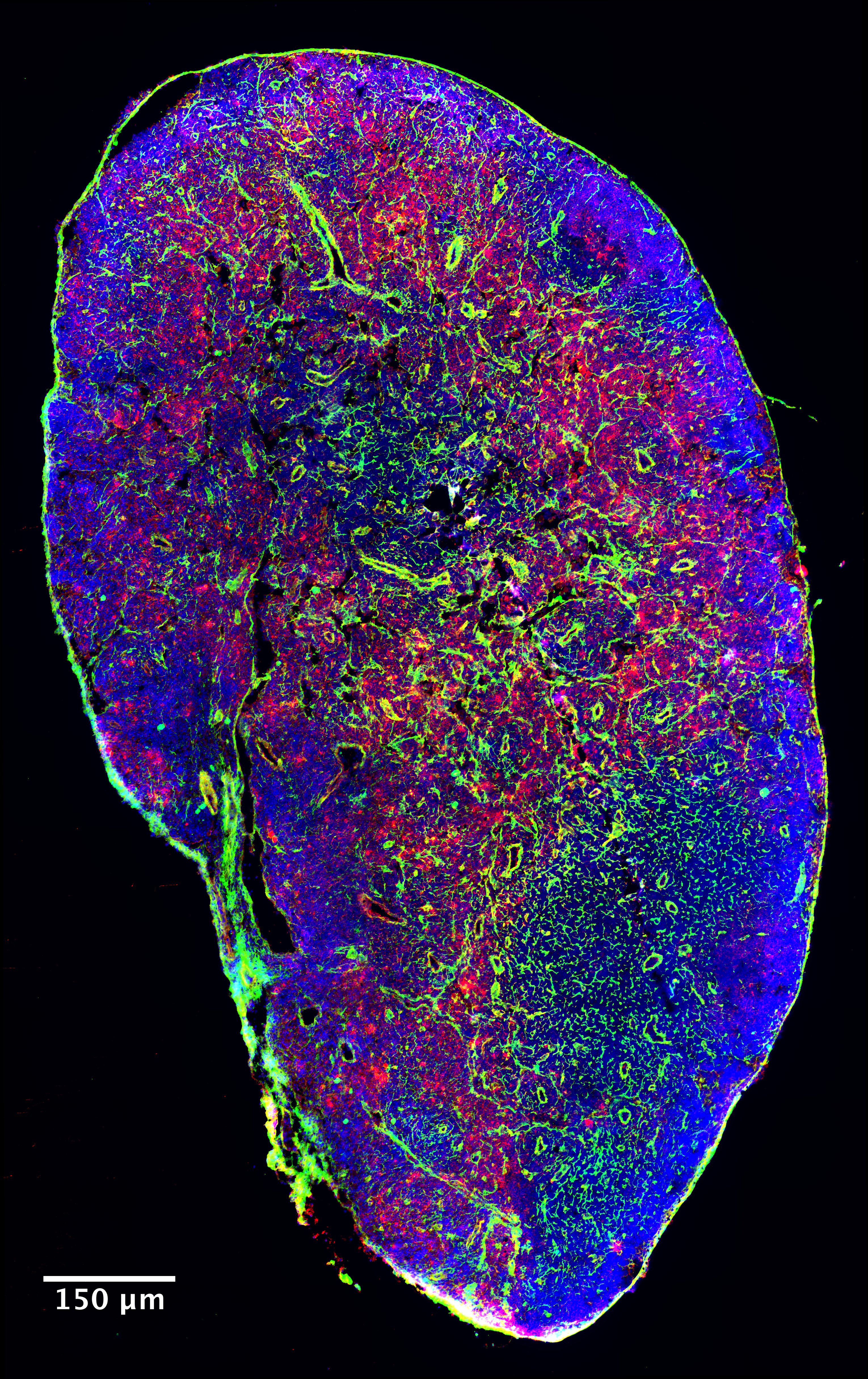 Warum ist das Filtersystem der Lymphknoten gehemmt? Was hat den Lymphknoten derart reprogrammiert, dass er sogar eine ideale Umgebung für Metastasen bildet? Wenn eine Patientin mit Brustkrebs Metastasen an den Lymphknoten unter den Achseln hat, dann ist die Prognose schlecht, denn dann hat sich der Tumor ausgeweitet. Angela Riedel wollte herauszufinden, wie der Tumor, bevor er den Lymphknoten befällt, diesen beeinflussen kann, zunächst am Deutschen Krebsforschungszentrum in Heidelberg, dann am Uniklinikum Würzburg. „Dabei habe ich mein Augenmerk auf die Fibroblasten gelegt. Das sind wichtige stromale Zellen, die dem Lymphknoten die Struktur geben, den Lymphknoten koordinieren und den Kontakt zwischen den dendritischen Zellen und T-Zellen herstellen. Wir haben schließlich gesehen, dass die Milchsäure das Stroma verändert. Die Untersuchungen in vitro konnten wir jetzt in vivo, an Mäusen, bestätigen.“