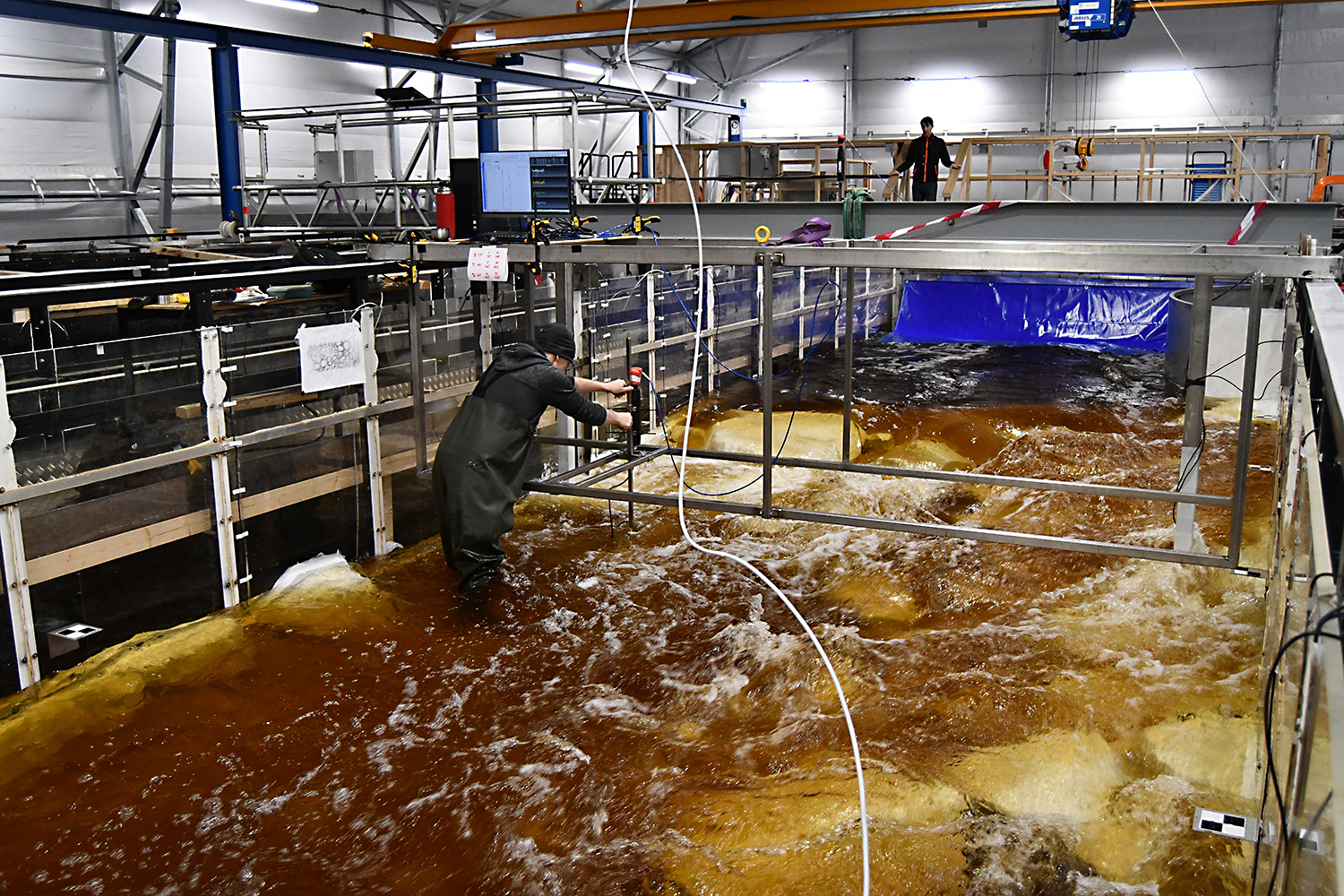 Von Niedersachsen ging es anschließend nach Mittelschweden: Im Wasserbaulabor des Projektpartners Vattenfall Research & Development in Älvkarleby wurde die Sohlengleite als 1:1 Modell im „Laxelerator“ nachgebaut. Diese weltweit einmalige Versuchsrinne ist speziell für großskalige Experimente mit Fischen konzipiert und ähnelt einer Rennbahn mit zwei parallelen, jeweils 24 Meter langen und vier Meter breiten Abschnitten, die über zwei 180°-Kurven verbunden sind. Das vier Meter breite und zwölf Meter lange Teilmodell der Sohlengleite wurde mittels CNC-Frästechnik aus Styropor hergestellt und konnte im September 2021 in Betrieb genommen werden. Das Modell hat Vattenfall so konzipiert, dass es mehrfach verwendet werden kann. Nach Abschluss der Versuche wurde es abgebaut und wartet nun auf den nächsten Einsatz für ähnliche Fragestellungen.