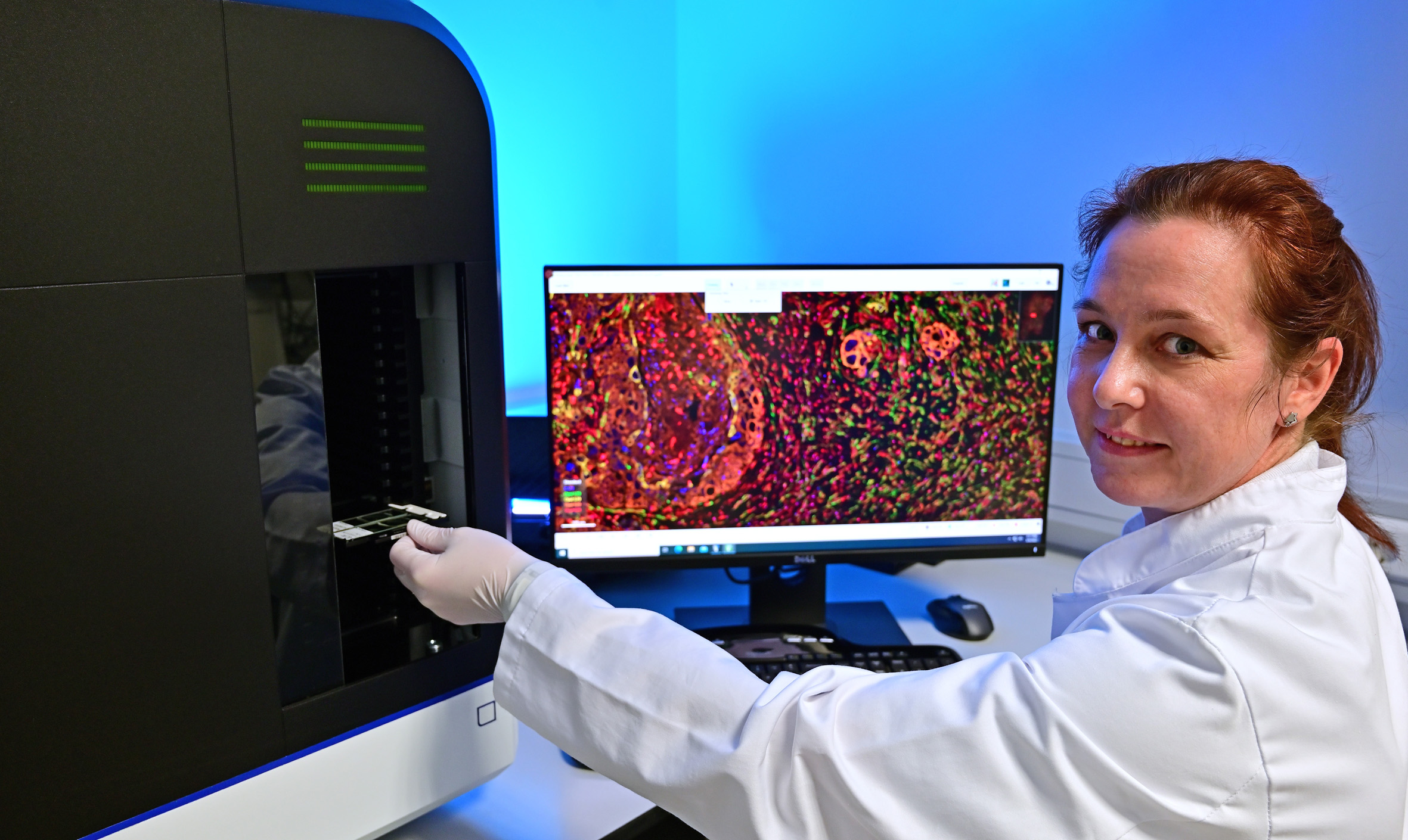 Die Pathologie am Universitätsklinikum Jena nutzt einen modernen Multispektral-Fluoreszenz-Scanner, um mit Hilfe von Mehrfachfärbungen in Gewebeproben Mechanismen der Tumorentstehung und –therapie zu untersuchen. Das Gerät wurde vom Freistaat Thüringen mit Mitteln aus dem EFRE-Fonds gefördert.