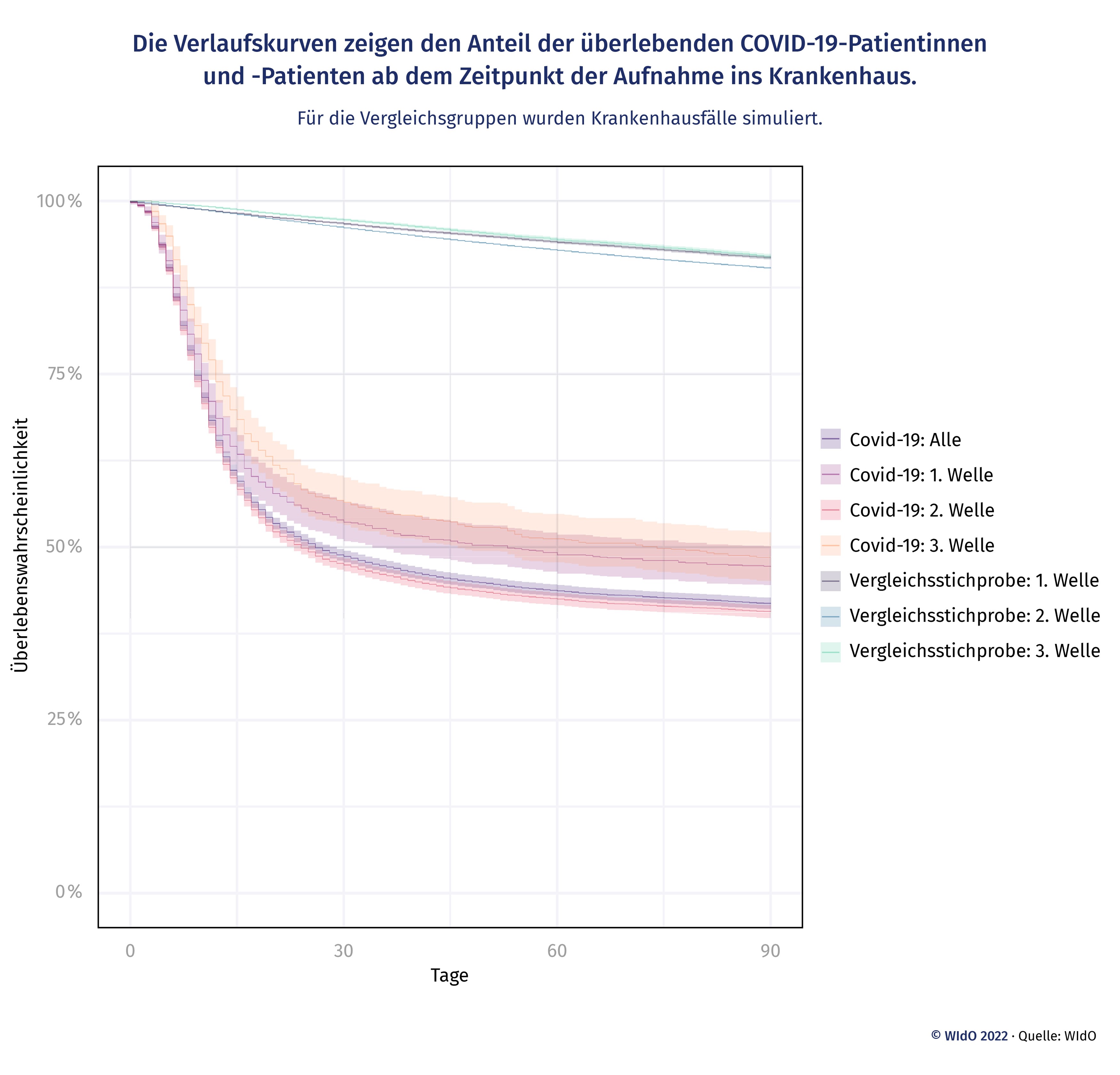 Danach verstarben von den eingelieferten Pflegeheimbewohnerinnen und -bewohnern im Durchschnitt 58 Prozent innerhalb der folgenden 90 Tage. Das Sterberisiko war innerhalb der zweiten Infektionswelle mit 59 Prozent am höchsten. In der ersten und dritten Welle lag es mit 53 Prozent beziehungsweise 52 Prozent etwas niedriger. Die Ursache für diese Unter-schiede könnten laut den Autoren die verschiedenen Krankenhaus-Aufnahmewahrscheinlichkeiten in den einzelnen Wellen sein.