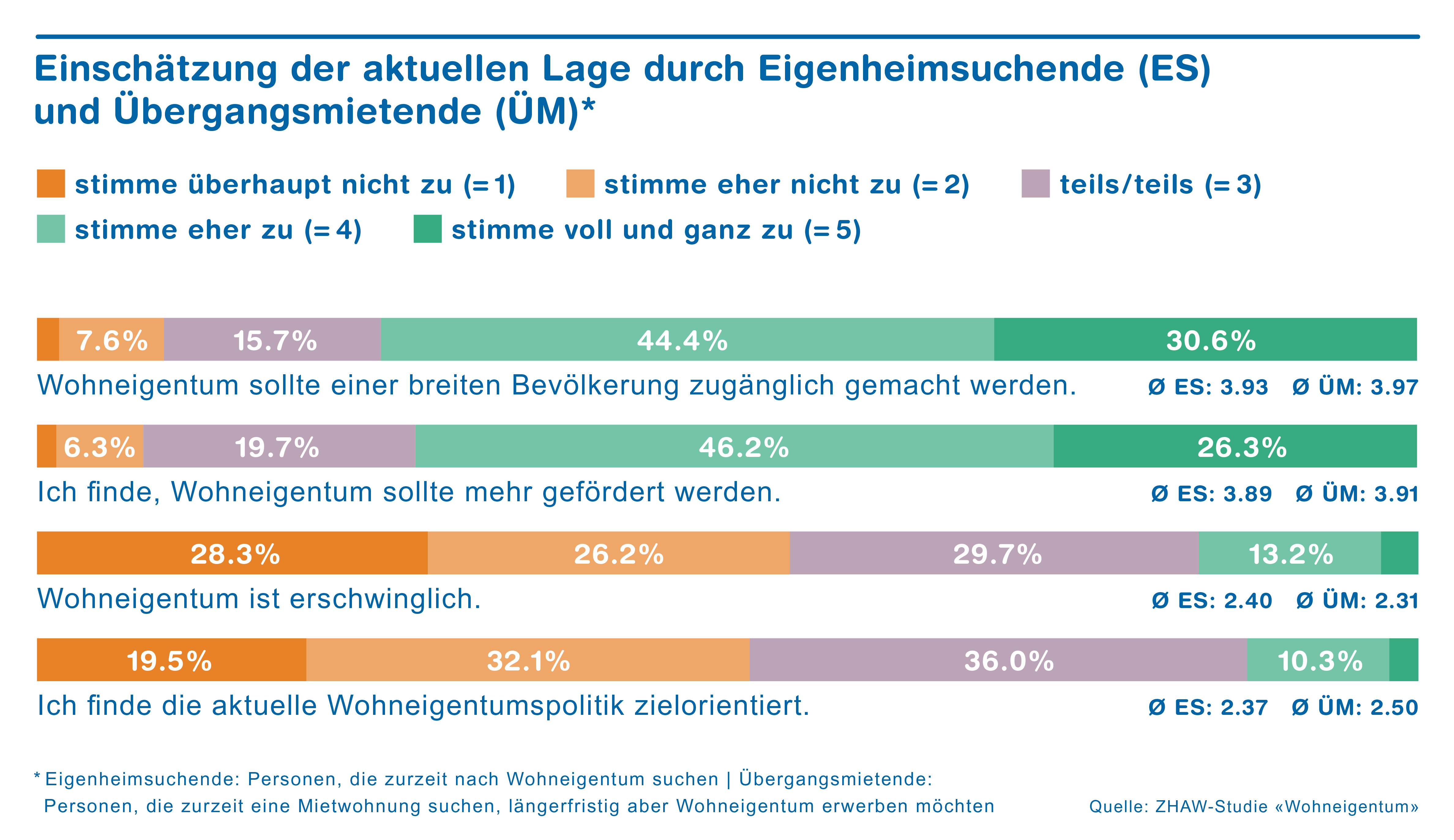 «Die Wahrnehmung vieler Menschen hierzulande ist also, dass der Wunsch nach Wohneigentum derzeit nur für einen privilegierten Kreis umsetzbar ist», sagt Holger Hohgardt vom Institut für Wealth & Asset Management der ZHAW. Drei Viertel der Personen, die bald oder längerfristig Wohneigentum erwerben wollen, wünschen sich entsprechend, dass dieses einer breiten Bevölkerung zugänglich gemacht wird. Die Ursachen für die fehlende Erschwinglichkeit orten die Befragten in erster Linie bei der Politik und den Behörden, gefolgt von der Bau- und Immobilienwirtschaft und den Finanzdienstleistern.