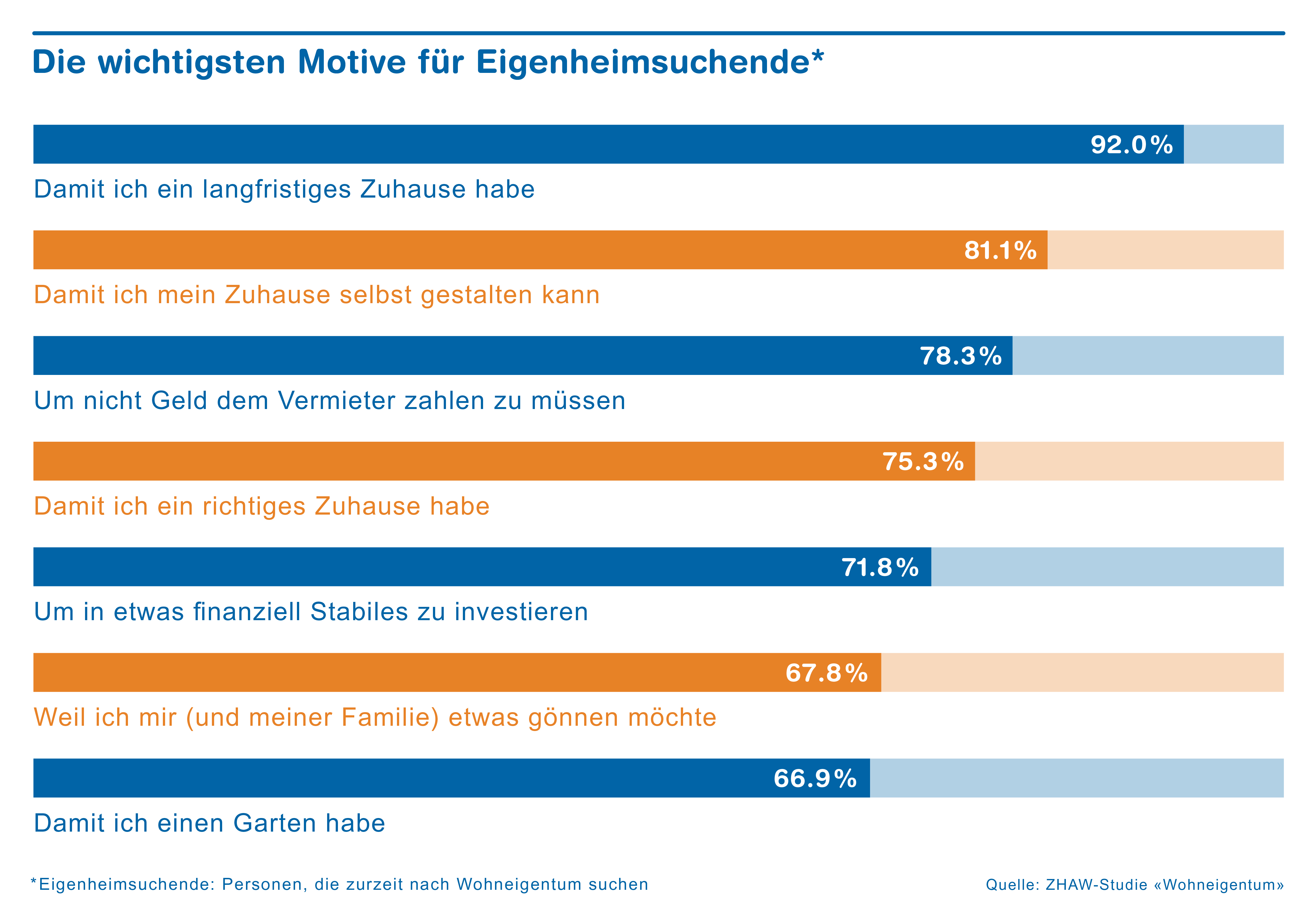 Die prinzipiellen Motive, um eine Eigentumswohnung oder ein Haus zu erwerben, sind überwiegend nicht-finanzieller Natur: Neun von zehn Personen, die aktuell Wohneigentum suchen, geben den Wunsch nach einem langfristigen Zuhause als Hauptgrund an. Weitere wichtige Gründe sind die Gestaltungsfreiheit und Autonomie. «Beim Traum von den eigenen vier Wänden geht es also in erster Linie um persönli-che Werte», sagt Holger Hohgardt. Dagegen möchten weniger als 20 Prozent der Eigentumssuchenden in Wohneigentum investieren, um dieses später mit Gewinn weiterzuverkaufen.