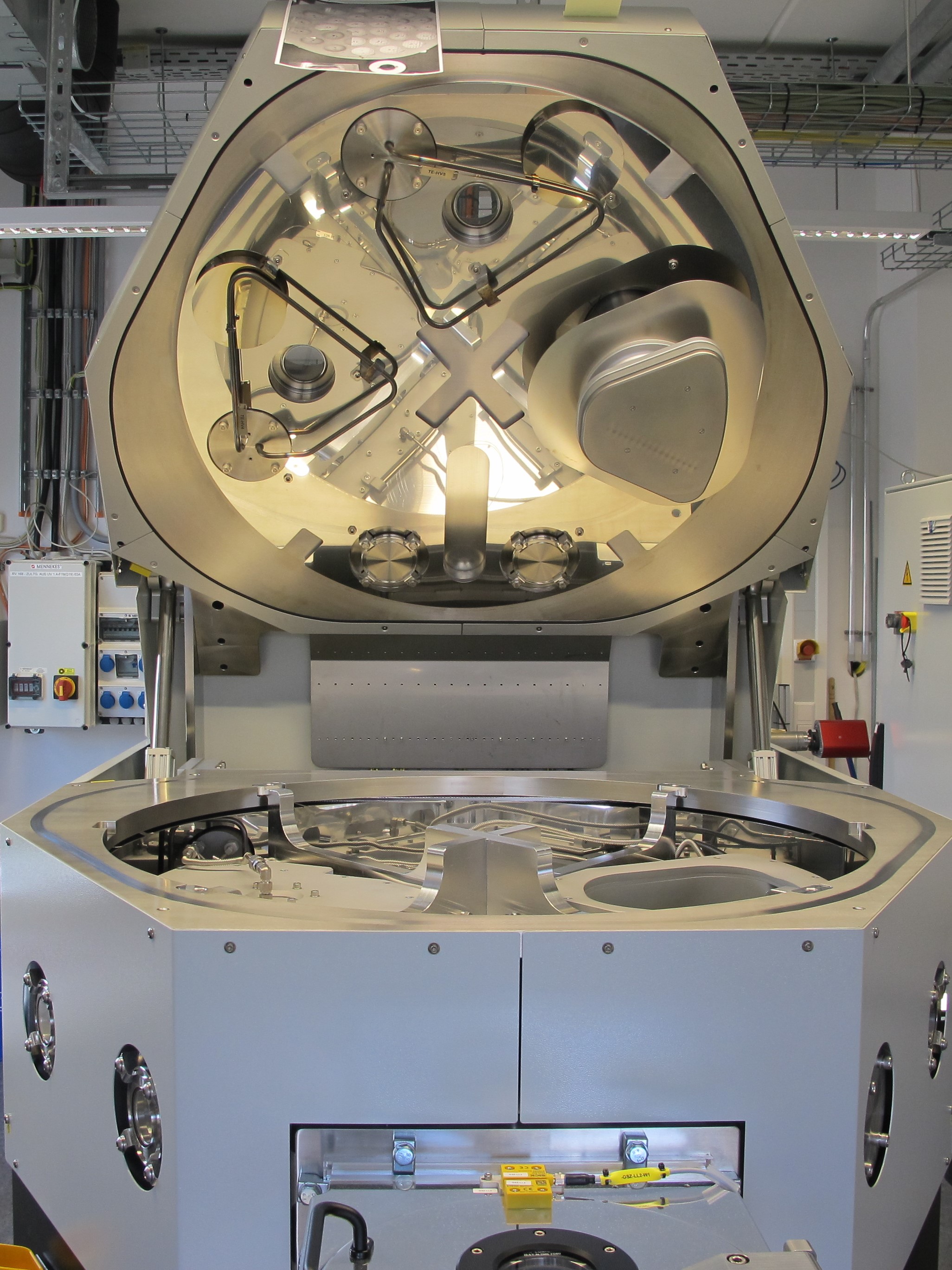 Die Anlage wurde von dem finnischen Unternehmen Beneq, einem führenden Anbieter im Bereich ALD-Technologie, in Zusammenarbeit mit dem LZH entwickelt. Der ALD-Prozess basiert auf selbstlimitierenden chemischen Reaktionen zwischen gasförmigen Precursoren und Substratoberflächen. In bisher üblichen Anlagen werden die Prozessreaktionen nacheinander durchgeführt, was einen zeitaufwändigen Gasaustausch der gesamten Reaktionskammer nötig macht. Anders in der Spatial ALD-Anlage am LZH: Hier laufen die Prozesszyklen räumlich getrennt ab. Die Anlage hat vier einzelne, durch Druck und Stickstoff abgetrennte Prozesskammern, in denen jeweils ein ALD-Reaktionsschritt abgeschlossen wird. Anschließend rotieren die Substrate in die nächste Kammer. So erreichen die Wissenschaftler:innen Auftragsraten die bisher nur mit anderen Beschichtungsverfahren möglich waren. Dies macht das Verfahren besonders wirtschaftlich und ermöglicht gleichzeitig einen hohen Durchsatz bei der optischen Beschichtung.