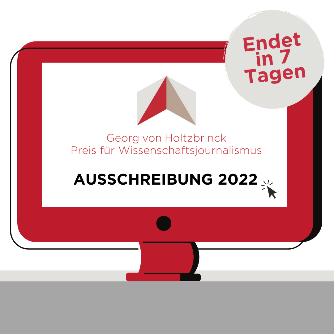 Die aktuelle Ausschreibung 2022 für den Georg von Holtzbrinck Preis für Wissenschaftsjournalismus endet am 4. April 2022 um 23:59 Uhr. In deutschsprachigen Medien publizierende Journalist*innen können sich in den drei Kategorien Text, Elektronische Medien und Nachwuchs bewerben. Die Preise für die Kategorien Text und Elektronische Medien sind mit 10.000 € dotiert, der Nachwuchspreis mit 5.000 €. Die Beiträge sollen allgemein verständlich sein und zur Popularisierung wissenschaftlicher Sachverhalte, insbesondere aus den Bereichen Naturwissenschaften, Technologie und Medizin, beitragen. Entscheidend ist die originelle journalistische Bearbeitung aktueller wissenschaftlicher Themen.
