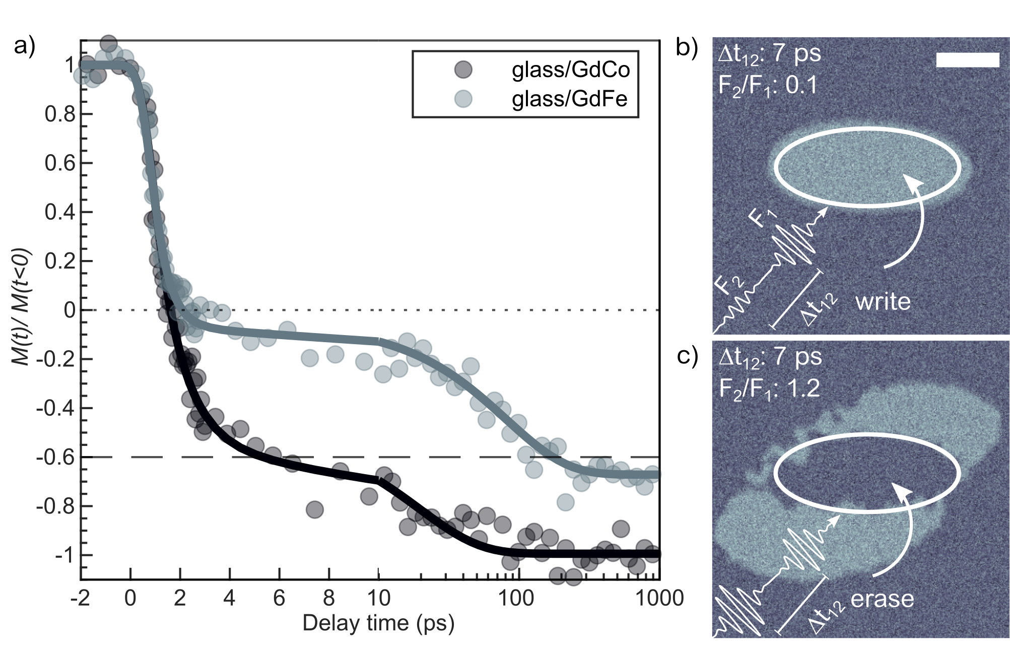 Wissenschaftlerinnen und Wissenschaftler des Max-Born-Instituts und der Freien Universität Berlin konnten zwei Strategien umsetzen, um den zeitlichen Abstand zwischen zwei aufeinanderfolgenden Femtosekunden-Laserpulsen zu reduzieren, die die Magnetisierungsrichtung solcher magnetischen Legierungen immer noch erfolgreich hin- und herschalten können. Erstens konnte durch systematische Änderung der Wärmeübertragungsraten durch Verwendung von Substraten aus amorphem Glas, kristallinem Silizium oder polykristallinem Diamant gezeigt werden, dass effiziente Kühlraten des magnetischen Systems eine Voraussetzung für die Beschleunigung der Sequenz des Doppelpuls-Umschaltens sind. Einen deutlich größeren Einfluss auf die Remagnetisierungsrate und damit auf die Frequenz der Schreib/Löschzyklen zeigte sich jedoch erst als das Übergangsmetall Eisen durch Kobalt ersetzt wurde. Der Vergleich der ultraschnellen Magnetisierungsdynamik einer GdFe- und GdCo-Legierung nach Einzelpulsanregung ist in Abb. 1a) dargestellt. Während die anfängliche Entmagnetisierung sehr ähnlich ist, ist die Relaxationsrate zu einem umgekehrten magnetischen Zustand deutlich unterschiedlich. Während GdCo seine Magnetisierung innerhalb von 5 ps auf 60% umkehrt, wird der gleiche Wert in GdFe erst nach etwa 200 ps erreicht. Die Forschenden erklären diese Beobachtung mit der stärkeren Austauschwechselwirkung zwischen benachbarten Kobalt Atomen (Co-Co) im Vergleich zu benachbarten Eisen Atomen (Fe-Fe), die zu einer schnelleren magnetischen Ordnung des Übergangsmetall-Untergitters führt. Die entsprechenden Ergebnisse der Doppelpulsexperimente für GdCo sind in Abb. 1b und c dargestellt: Die magneto-optischen Bilder zeigen eine entgegengesetzte Magnetisierungsrichtung des Endzustands bei einem Puls-zu-Puls-Abstand von nur Δt12=7 ps. In b) reicht die Fluenz des zweiten Pulses, F2, nicht aus, um die vom ersten Puls gesetzte Magnetisierung zu beeinflussen. In c) wurde die Energie des zweiten Pulses, F2, erhöht, sodass die Magnetisierung erfolgreich wieder zurückgeschaltet werden konnte.