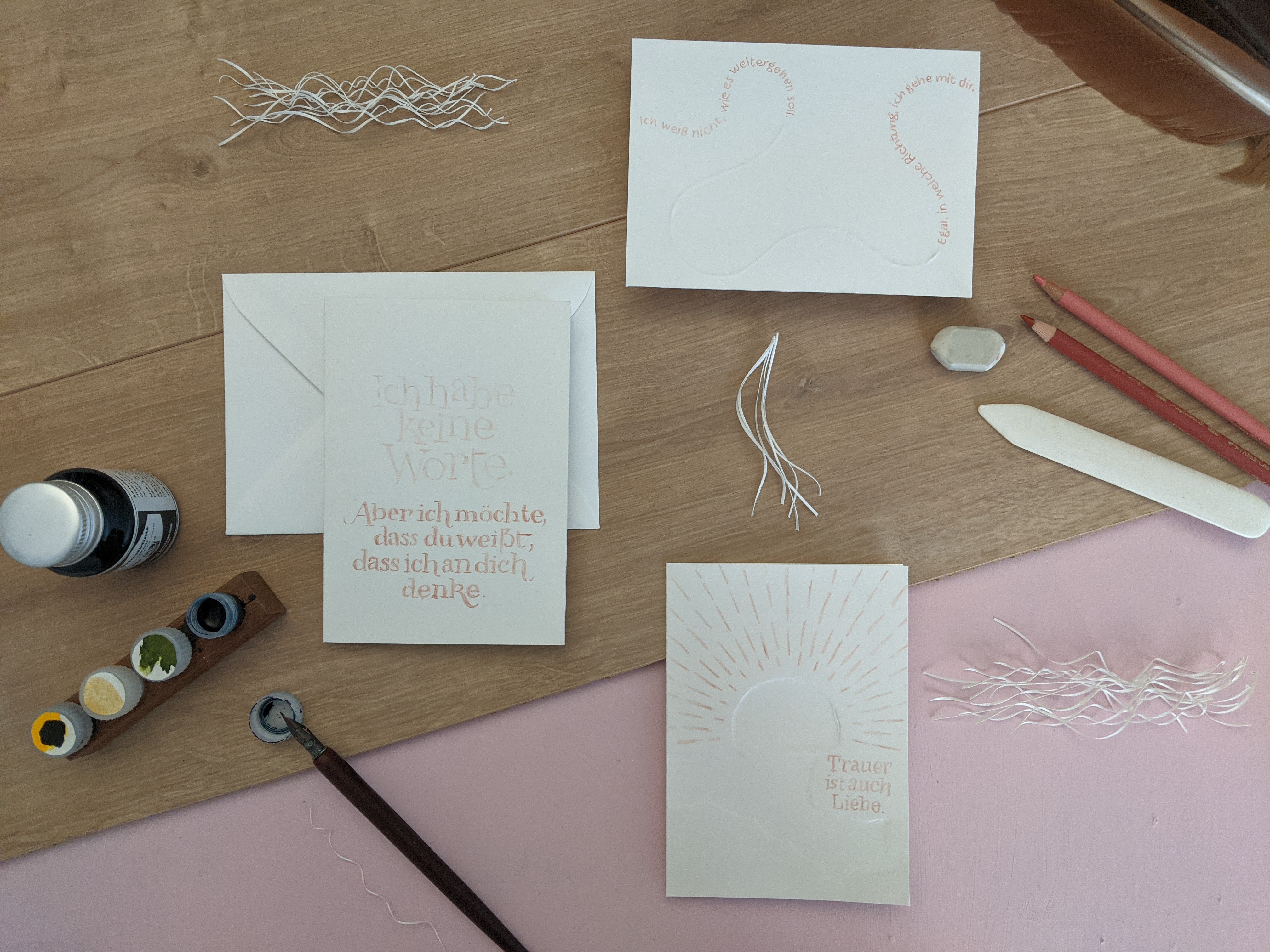 So ist die Designerin auf die Idee gekommen: Immer wieder kamen Kundinnen und Kunden in Marie Pischels Atelier für Schriftgestaltung im Bielefelder Osten, die von der Angebotspalette an Trauerkarten enttäuscht waren oder ganz besondere Wünsche hatten. Zwischen Gestaltung und Gesprächen wurde Marie Pischel klar, dass Trauerkarten mehr sein können als ein Stück Papier: nämlich eine Brücke zwischen Trauernden und Tröstenden.