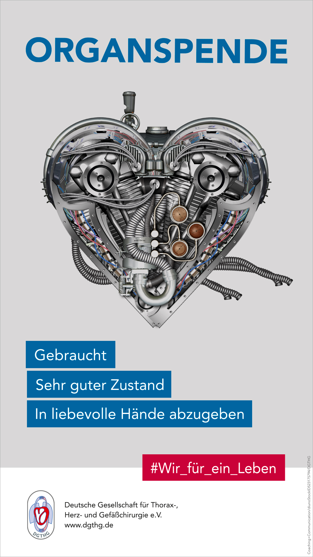 Das gewählte Motiv der Aktion: ein Motor in Herzform. „Unser Herz ist der leistungsstarke Lebensmotor, der pausenlos funktionieren und ununterbrochen schlagen muss“, so Prof. Böning, Präsident der DGTHG. „Auch ein Spenderherz muss unentwegt arbeiten und kann diese lebenswichtige Aufgabe länger als 20 Jahre bewältigen. Daher bleibt die Organspende der Goldstandard.“