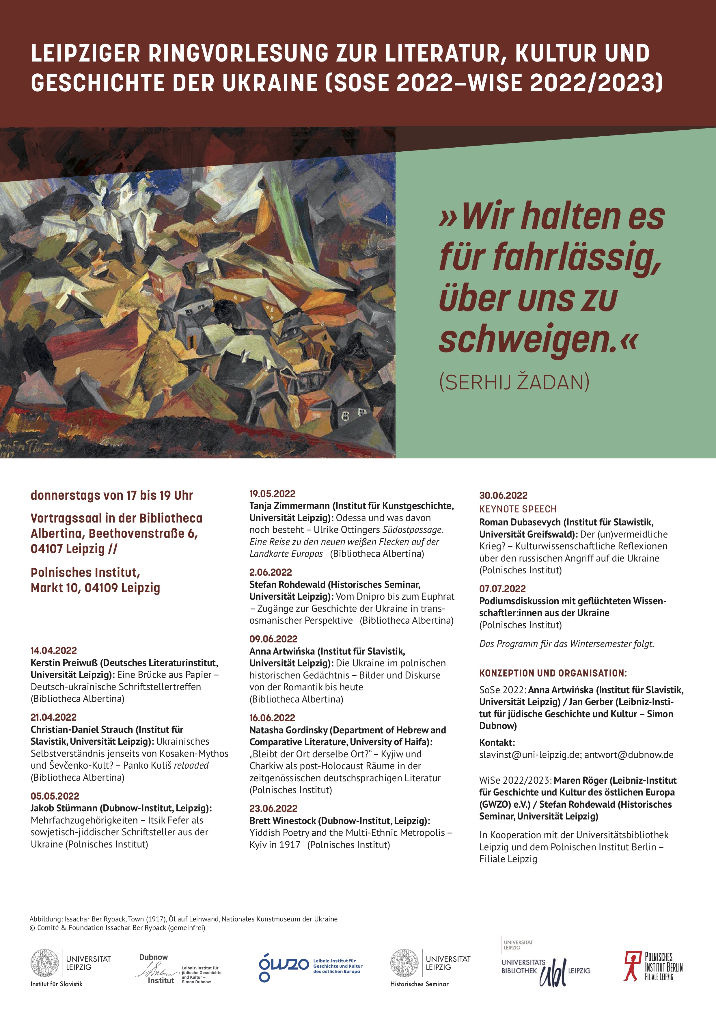 Die Ringvorlesung wird durch ein Bild des jüdischen Malers Issachar Ber Ryback (1897–1935) illustriert. Es ist eine avantgardistische Impression über eine Katastrophe, möglicherweise über ein Pogrom. „Mit dem Bild wollen wir zeigen, dass die Ukraine nicht nur ein Land der Tradition, sondern auch der Moderne ist. Ber Rybach war ein Vertreter der künstlerischen Avantgarde, die gerade in der Ukraine des frühen 20. Jahrhunderts eine große Ausstrahlungskraft hatte“, hebt Juniorprofessorin Dr. Anna Artwinska hervor.