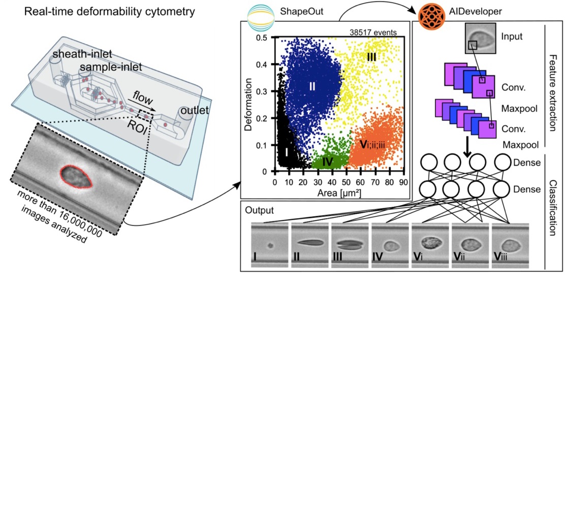 Rechts: Mit ShapeOut, einem Open-Source-Softwaretool, wurden die Daten aufgezeichnet. Das Punktdiagramm zeigt eine Messung von über 38000 Blutzellen eines Studienteilnehmers, aufgetragen in Zellgröße (projizierte Fläche [μm2]) und Zellverformbarkeit. Zur besseren Darstellung ist das Verhältnis von Leukozyten (IV, Vi-iii) zu Erythrozyten und Thrombozyten (I-III) künstlich erhöht. Um die verschiedenen Blutzelltypen zu identifizieren, wurden die Bilder in AIDeveloper importiert, ein Open-Source-Softwaretool zum Trainieren, Bewerten und Anwenden neuronaler Netze für die Bildklassifizierung. Ein auf der LeNet5-Architektur basierendes neuronales Netz, das bereits für die Klassifizierung von Blutzellen trainiert wurde, wurde in AID geladen und zur Klassifizierung von I = Thrombozyten, II = Erythrozyten, III = Erythrozyten-Doubletten, IV = Lymphozyten, Vi = Eosinophile, Vii = Neutrophile und Viii = Monozyten verwendet. Schließlich wurden die Mittelwerte für die Zellverformbarkeit und die Zellgröße für jeden Zelltyp einzeln extrahiert.