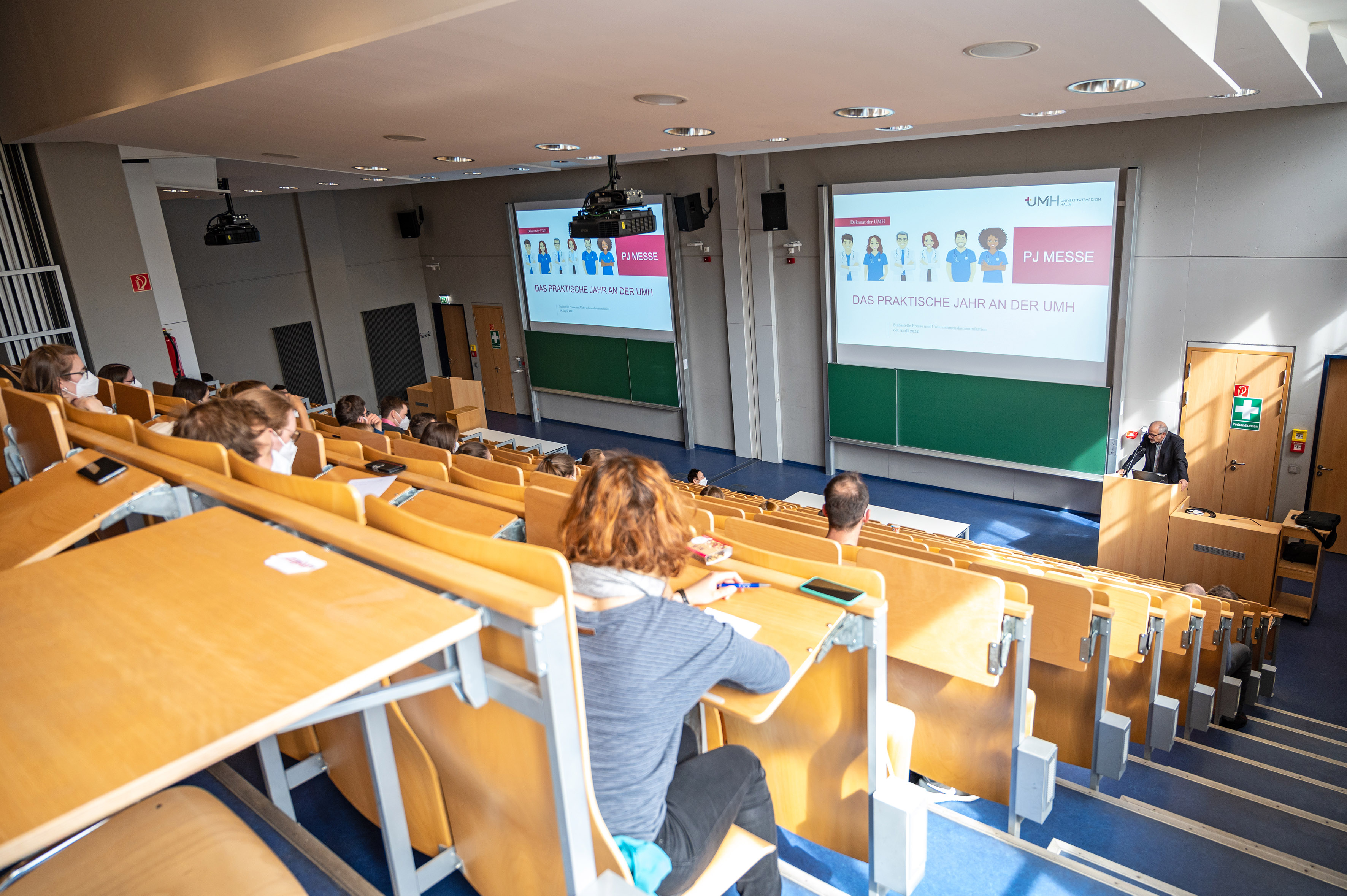 Insgesamt 21 Stände luden dazu ein, ins Gespräch zu kommen, Fragen zu stellen und Informationen zu sammeln. Wie der Dekan der Medizinischen Fakultät bei der Eröffnung der PJ-Messe, die sowohl im Hörsaal stattfand, als auch auf die Online-Plattform Hyhyve übertragen wurde, sagte, sollte die Messe vor allem Kontakte ermöglichen. „Es geht einerseits darum, die gute inhaltliche Ausbildung mit einem breiten Fächerangebot bei uns zu zeigen, und andererseits, sich im Wettbewerb mit anderen Uniklinika als zukünftiger Arbeitgeber zu präsentieren“, so Gekle. „Wir bewerben uns sozusagen bei Ihnen“, sagte der Ärztliche Direktor des Universitätsklinikums, Prof. Dr. Thomas Moesta, in seiner kurzen Begrüßungsrede.