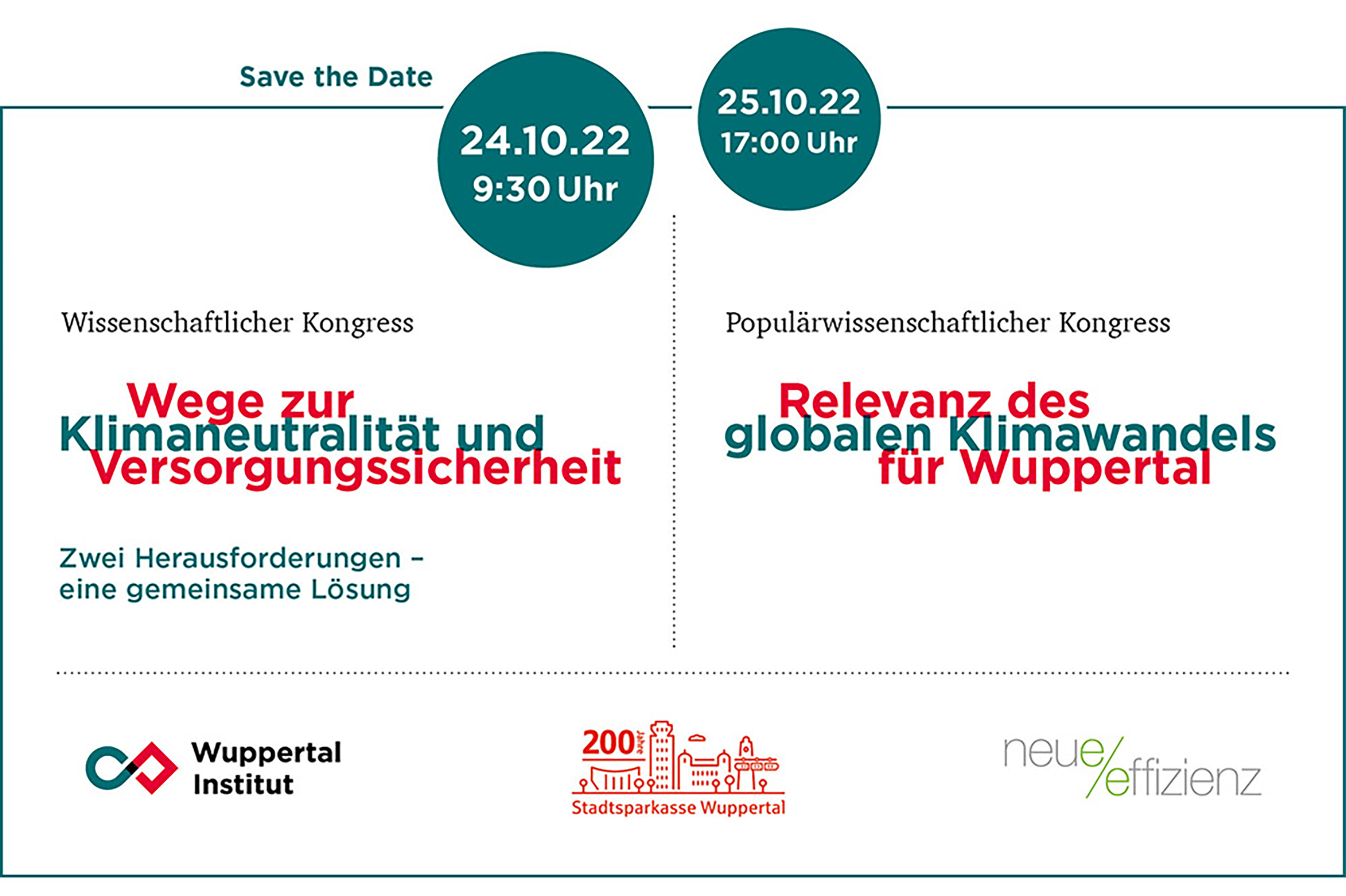 Wissenschaftlicher und populärwissenschaftlicher Kongress anlässlich des 200. Jubiläums der Stadtsparkasse Wuppertal in Kooperation mit dem Wuppertal Institut und der Neuen Effizienz am 24. und 25. Oktober 2022.
