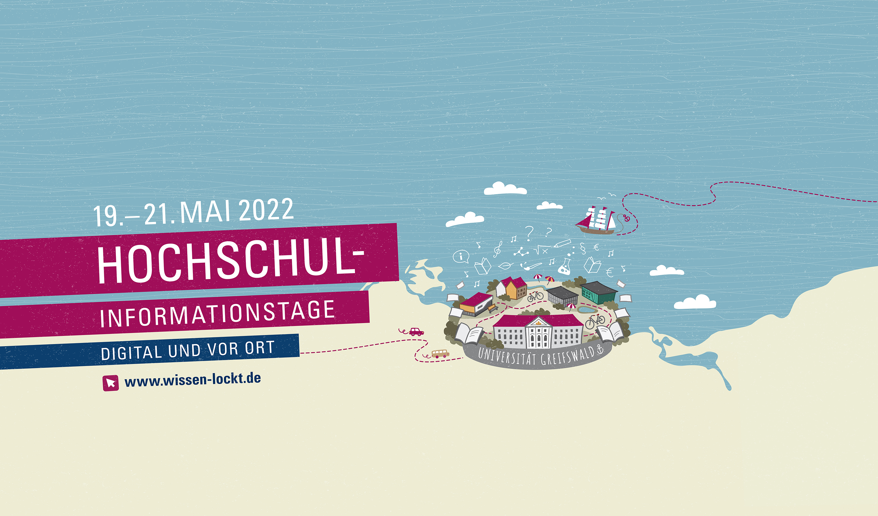 Vom 19. bis 21. Mai 2022 lädt die Universität Greifswald Studieninteressierte, Eltern und Lehrer*innen ein, bei den Hochschulinformationstagen virtuell und in Präsenz Campusluft zu schnuppern. Ob Bachelor, Master, Diplom oder Staatsexamen – Vertreter*innen aus den fünf Fakultäten und die Zentrale Studienberatung stellen die vielfältigen Studienmöglichkeiten an der Universität vor. Auf der Onlineplattform www.wissen-lockt.de stehen über 80 Veranstaltungen zur Auswahl.