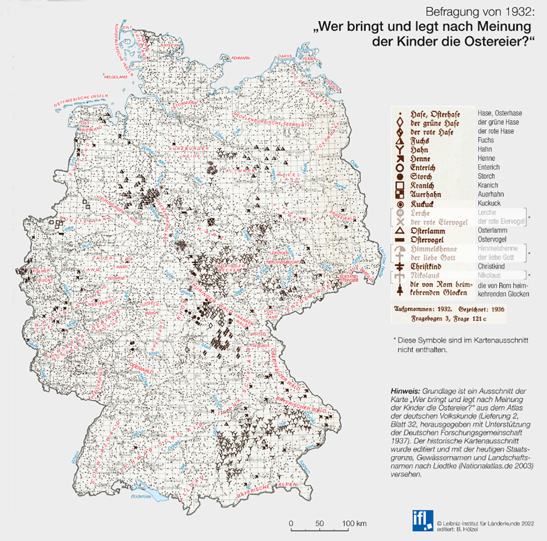 Dass es nicht immer und überall der Hase war, der die Eier gebracht hat, zeigt ein Blick auf die Karte „Wer bringt und legt nach Meinung der Kinder die Ostereier?“ aus dem Atlas der deutschen Volkskunde aus dem Jahr 1937, einem methodisch und ideologisch nicht unproblematischen Werk. Laut der zugrundeliegenden Befragung wurden je nach Region auch andere Tiere wie Hahn oder Fuchs als Überbringer der ostertypischen Überraschungen genannt. Hinsichtlich ihrer Verbreitung konnten es die Konkurrenten indes nie mit dem niedlichen Hasen aufnehmen.
