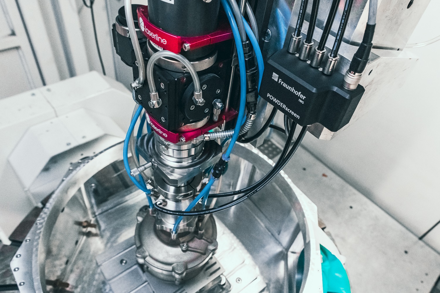 A particular advantage is the universal applicability: POWDERscreen can be mounted on any process head for powder laser cladding. One application example in which it shows its strengths particularly well is the COAXquattro nozzle. This process head was developed at Fraunhofer IWS to feed up to eight different powders or wires in separate channels into the laser focus to produce in-situ alloys. Since the COAXquattro supports up to 30 grams per second per channel, significant powder rates can be achieved. Because of the large feed rates, the combination of COAXquattro and POWDERscreen is particularly suitable for high-performance processes in which large and complex components have to be produced, coated or repaired with high quality, reproducibility and speed.