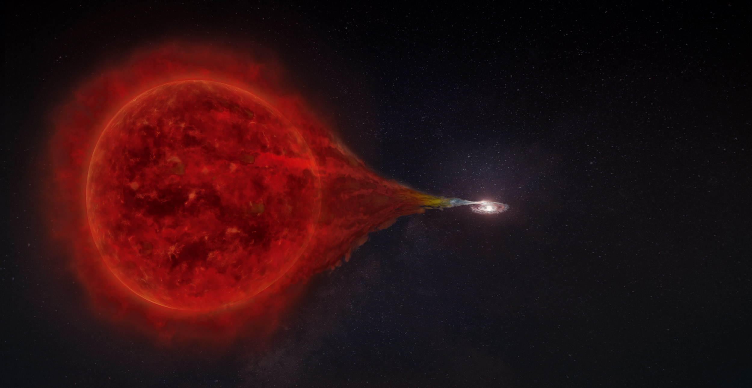 Wenn ein Stern stirbt, dehnt er sich zunächst zu einem Roten Riesenstern aus und kollabiert dann zu einer Sternenleiche, einem Weißen Zwerg. Dieser besteht aus einem sehr dichten Material: ein Teelöffel davon würde etwa eine Tonne wiegen. Unter bestimmten Umständen können diese Sternleichen noch einmal gigantische Explosionen hervorrufen: Wenn der Weiße Zwerg einen Begleiter hat, der seinerseits in die Phase des Roten Riesen übergeht, kann der Wasserstoff aus den ausgedehnten äußeren Schichten des Riesen der enormen Anziehungskraft des dichten Zwergs erliegen und sich auf dessen Oberfläche ansammeln. Der „tote“ Stern entzieht dem aktiven Stern also Gas und wird deshalb auch „Vampirstern“ genannt. Vereinzelt kann es in solchen Systemen sogar zu Kernexplosionen auf der Oberfläche kommen, die einen Großteil des Wasserstoffs und der Fusionsprodukte ins All schleudern. Da die Explosion extrem hell ist, wird der Vorgang auch „stella nova“ (neuer Stern, kurz „Nova“) genannt. In manchen Fällen wiederholt sich der Gastransfer und damit auch der Nova-Ausbruch. Das wird als wiederkehrende Nova bezeichnet.