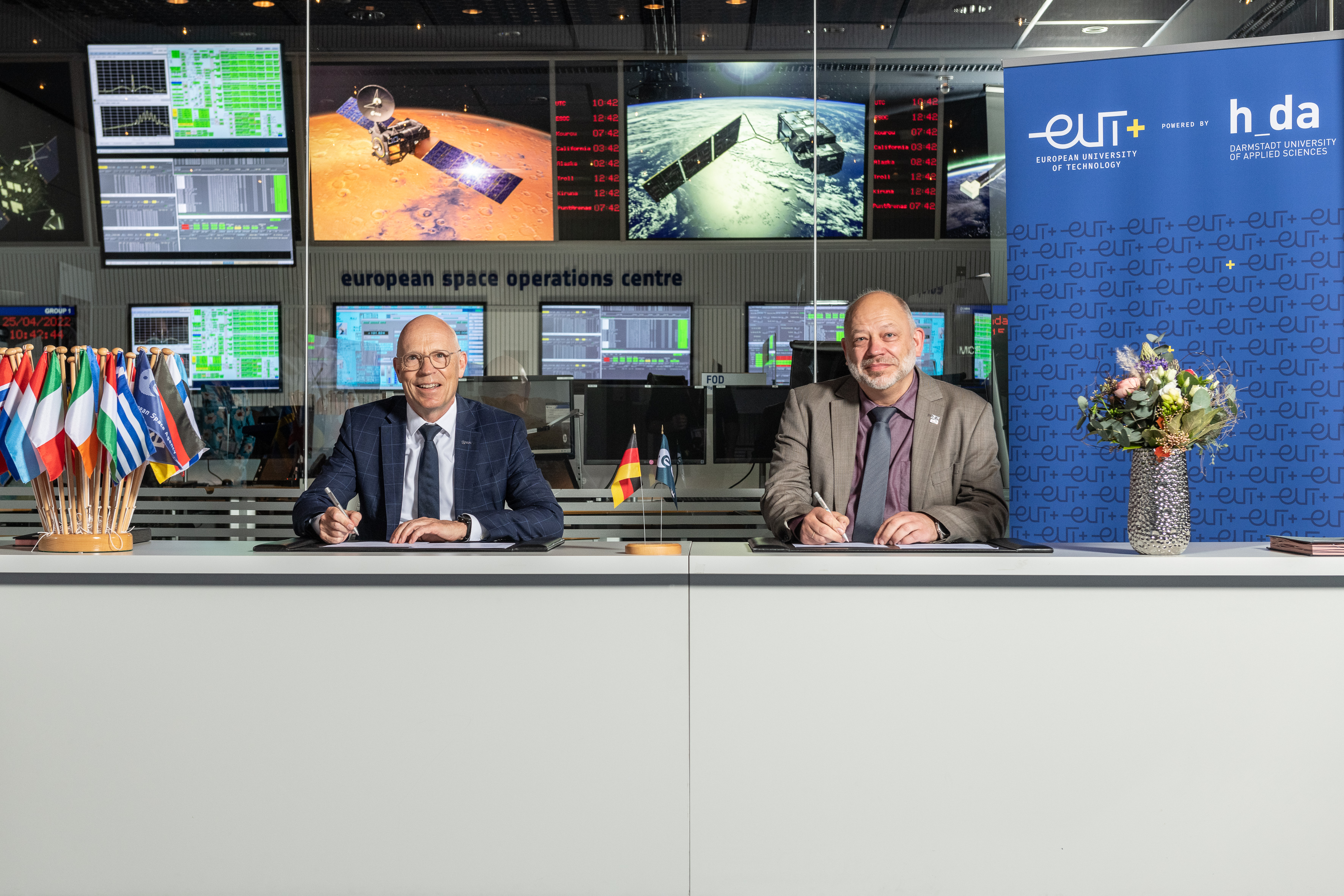 Darmstadt University of Applied Sciences (h_da) as part of the European University of Technology (EUt+) and the European Space Agency ESA are intensifying their cooperation. Prof. Dr. Arnd Steinmetz, h_da President, and Dr. Rolf Densing, Director of Operations at ESA, today signed the corresponding agreement. The "Memorandum of Collaboration" defines the framework for joint lecture series or master theses, starting with main topics like artificial intelligence, cyber security and life cycle analysis.