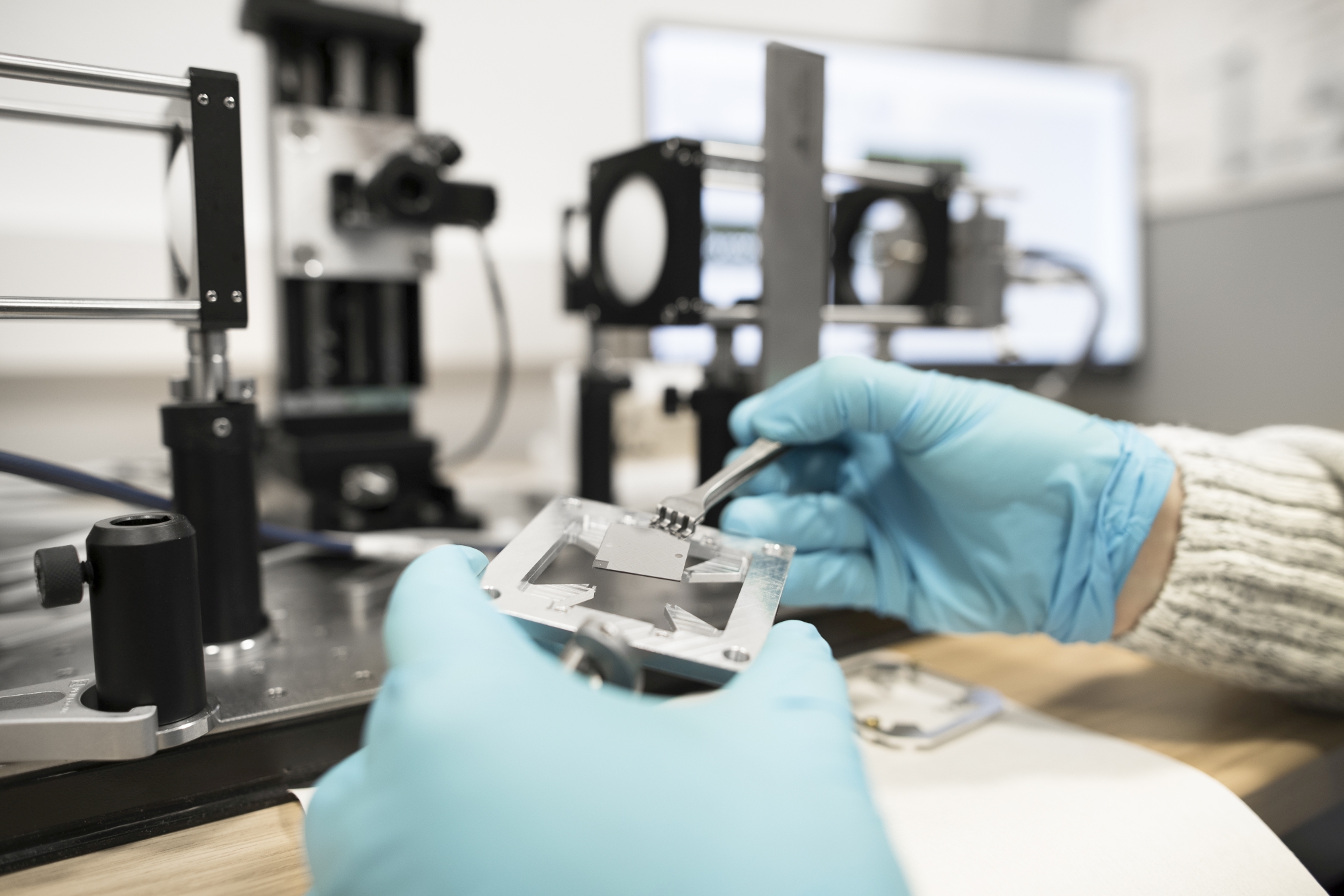 Neben der technischen Chipentwicklung spielt bei dem Projekt auch die Biochemie eine wichtige Rolle: Dabei geht es darum, die Chips mit passenden Fänger-Molekülen auszustatten, um die gewünschten biologischen Strukturen – zum Beispiel Viren – auf dem Sensor zu binden. Statt mit Viren arbeiten die WissenschaftlerInnen dabei zunächst mit sogenannten „Exosomen“. „Das sind zelluläre Strukturen, die Viren im Aufbau stark ähneln, die dabei aber für die Arbeit im Labor ungefährlich sind“, erklärt die Doktorandin und Chemikerin Merle Richter. Exosomen seien darüber hinaus noch aus einem anderen Grund interessant, berichtet Richter: „Sie fungieren als Marker für bestimmte Krebsarten. Wenn es uns im ersten Schritt des Projektes also gelingt, Exosomen auf der Chip-Oberfläche zu binden, ließe sich damit bereits eine Methode zur Krebserkennung entwickeln – ein Bereich, mit dem sich insbesondere unsere KollegInnen in Erlangen-Nürnberg beschäftigen.“