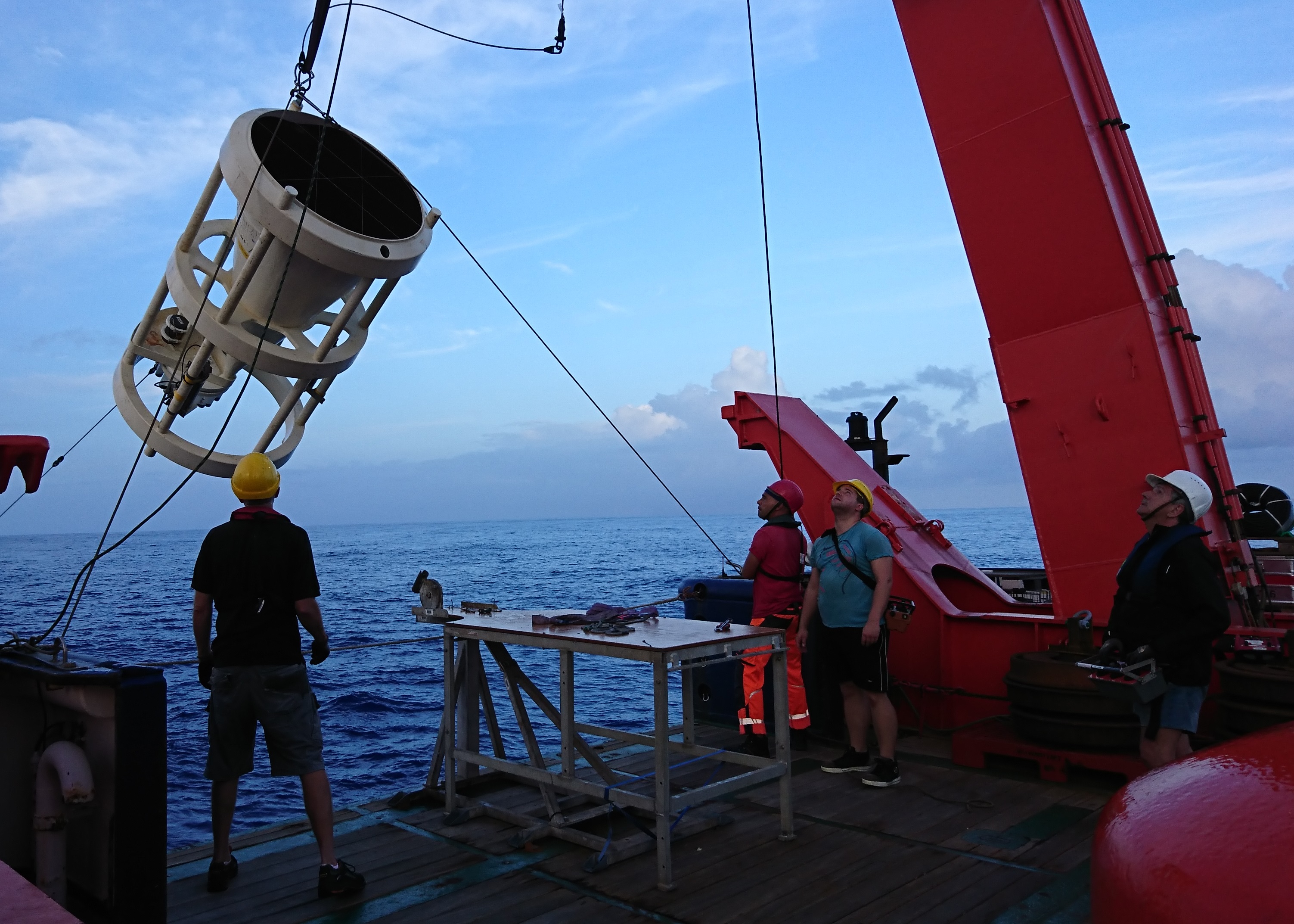 Endlich, da sind sie! Eine Reihe von orangen Bojen taucht aus der Tiefe des Wassers auf, tänzelt auf der Oberfläche, gar nicht weit entfernt vom Forschungsschiff „Meteor“. Die Treibkörper sind das obere Ende einer Vorrichtung, die auf 4.200 Metern mit einem Anker am Meeresboden befestigt gewesen ist. Fixiert an Ketten positionierte sie zwei Trichter in 3.500 und 1.500 Metern Tiefe – Sinkstoff-Fallen, mit denen das ganze Jahr über Proben des zum Meeresboden absinkenden Materials genommen wurden. Per akustischem Signal hatte die Besatzung die Konstruktion gelöst, eine gute Viertelstunde brauchten die Bojen bis an die Oberfläche.